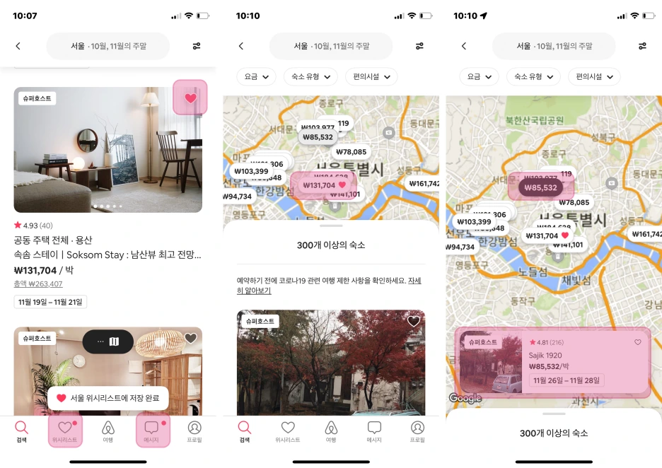 에어비앤비는 자신이 관심 있는 숙소에 하트를 누를수록되어있다. 이 하트별 숙소를 모아둘 수도 있지만 지도상에 바로 위치가 어디인지 한 번에 확인할 수도 있다. 내가 관심 있어 하는 숙소와 그렇지 않은 다른 숙소들을 하트로 확실하게 대비하여 표시하고 있다. 또한 내가 한번 확인한 숙소는 회색으로 처리가 된다. 그렇게 확인한 숙소, 확인하지 않은 숙소, 관심 있는 숙소로 폰 레스토프 효과로 구분해 줌으로써, 현재 사용자가 그다음 무엇을 누르고 최종적으로 어떤 숙소를 눌러 결제까지 이어지게 해야 하는지 안내해 주는 역할을 하고 있다.