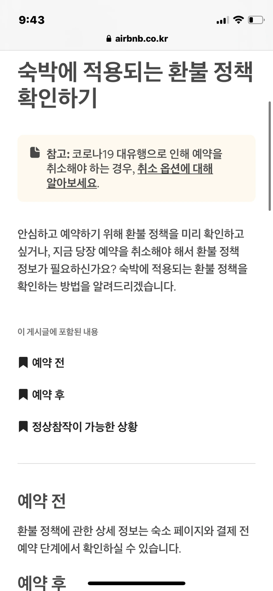 사실 에어비앤비에서 사람들이 가장 많이 하는 실수는 바로 예약취소, 혹은 환불일 것이다. 하지만 에어비엔비는 환불 절차가 그리 쉽지 않아 보인다. 각 숙소마다 호스트가 정해둔 규정이 다르기 때문에 환불이 쉽지 않은 경우가 있다. 환불 같은 경우 환불 정책을 자세히 봐야 하는데 내용을 쉽게 이해하기 어려워 보인다. 그래서 나는 에어비앤비에서 포스텔의 법칙이 확실하게 적용되어 있지 않다고 생각한다. 사용자가 환불을 요청하는 경우 대다수 고객센터를 통해 응대를 받아 설명을 듣고 처리를 진행한다. 사전에 사용자가 더 쉽게 인지하고 받아들 이 수 있도록 UX가 설계되었다면 고객센터를 이용하지 않고도 쉽게 취소와 환불 처리가 가능했을 것이다.