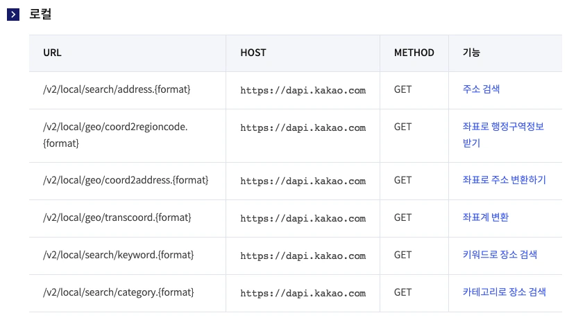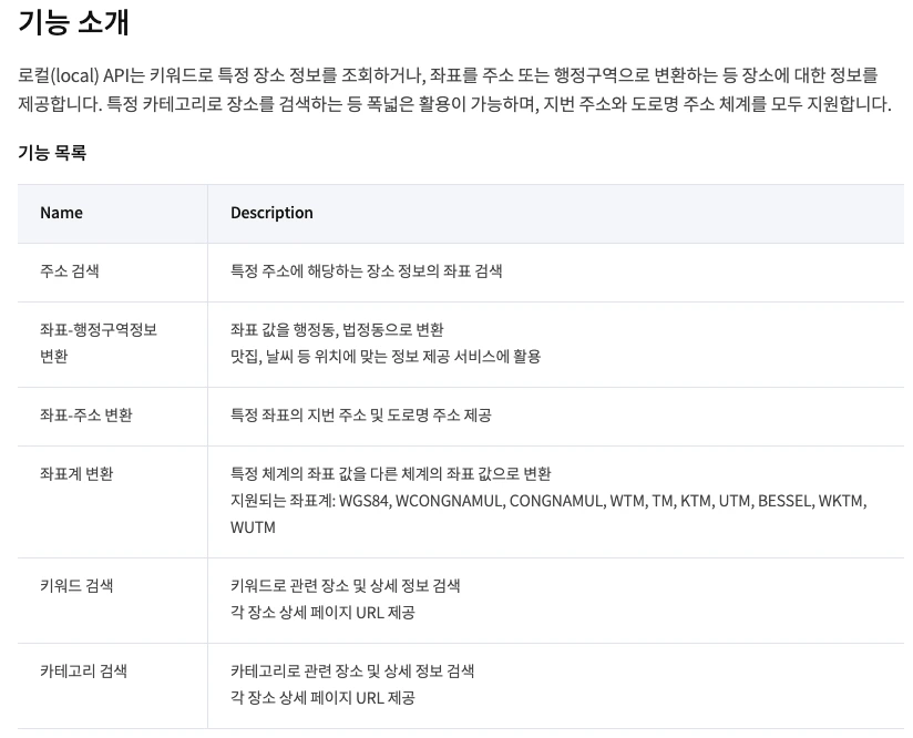 카카오 로컬 API 기능은 주소 검색하기, 좌표로 행정구역 정보 받기, 좌표로 주소 변환하기, 좌표계 변환하기, 키워드로 장소 검색하기, 카테고리로 장소 검색하기가 있다. 카카오 로컬 API는 URL 구조로 REST API이며, GET 메서드(METHOD)를 사용하고 리턴 형식(응답)은 JSON과 XML을 지원하고 있다. 완벽하게 REST 방식을 다 지키는 건 아니라서 RESTful API는 아니다.