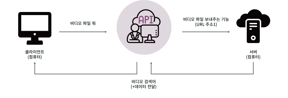 클라이언트가 '비디오 파일 줘'라고 서버에게 요청하면 API는 '비디오 파일 보내주는 기능(URL 주소 1)' 이런 식으로 기능별 요청을 받는 각각의 API 주소를 통해 서버로 전달한다. 서버가 요청을 받으면 다시 API를 통해 '비디오 검색어'라는 데이터와 함께 클라이언트에게 응답을 보낸다.