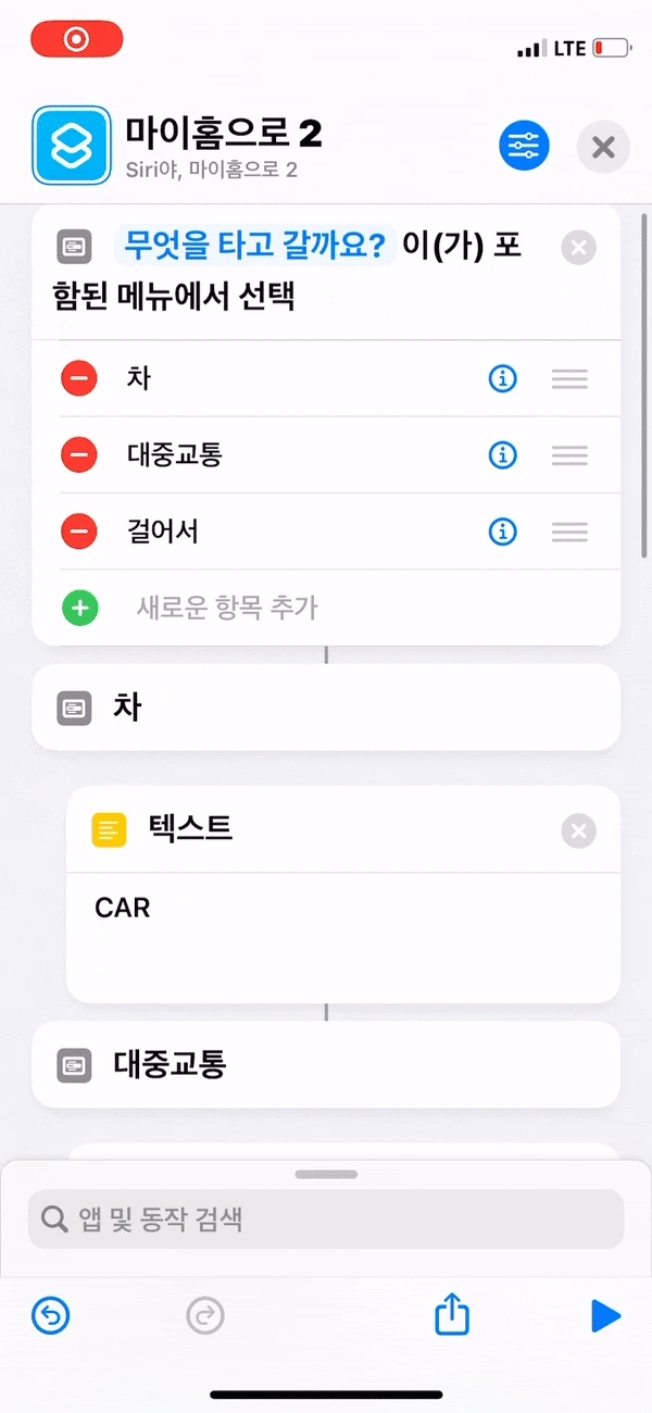 내가 설정해둔 단축어는 내 집 주소를 위도와 경도 값을 각각 lat, long 함수에 입력하면 주소로 변환해서 나온다. 여기에 추가적으로 걸어서, 대중교통, 차 수단을 선택하는 함수를 추가하고 카카오 맵 url 열기까지 추가해 주면, 카카오 맵에서 길 찾기 하는 화면으로 바로 검색되어서 나온다.