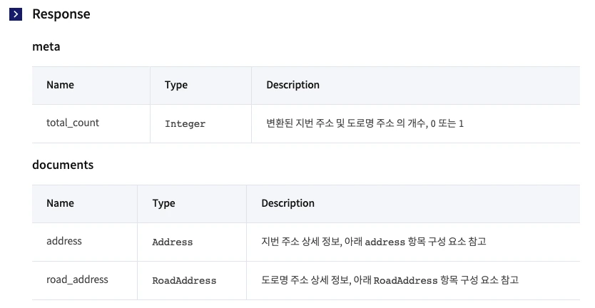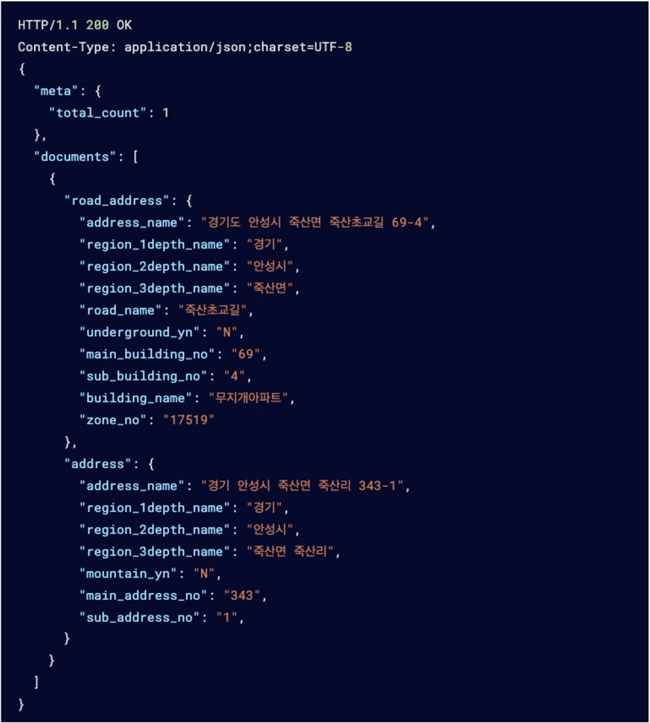 meta, documents, Address, RoadAddress 값으로 적어서 응답해 준다.