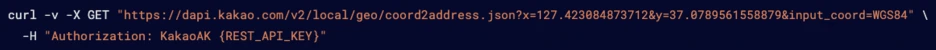 주소로 변환하고 싶은 장소의 X좌표 값(경도), Y좌표 값(위도), 좌표 체계 값을 URL 주소로 적어 서버에 요청하면,