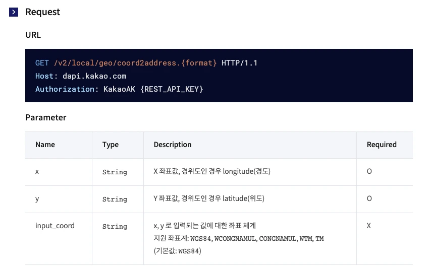 Request 값을 이용해 서버에 요청하면 Response 값으로 응답을 받는 구조이다. 좌표로 주소 변환하기 기능은 다음과 같이 해석할 수 있다.