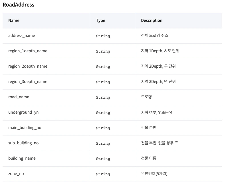 - 도로명 주소 상세 정보, 아래 RoadAddress 항목 구성 요소를 참고해라