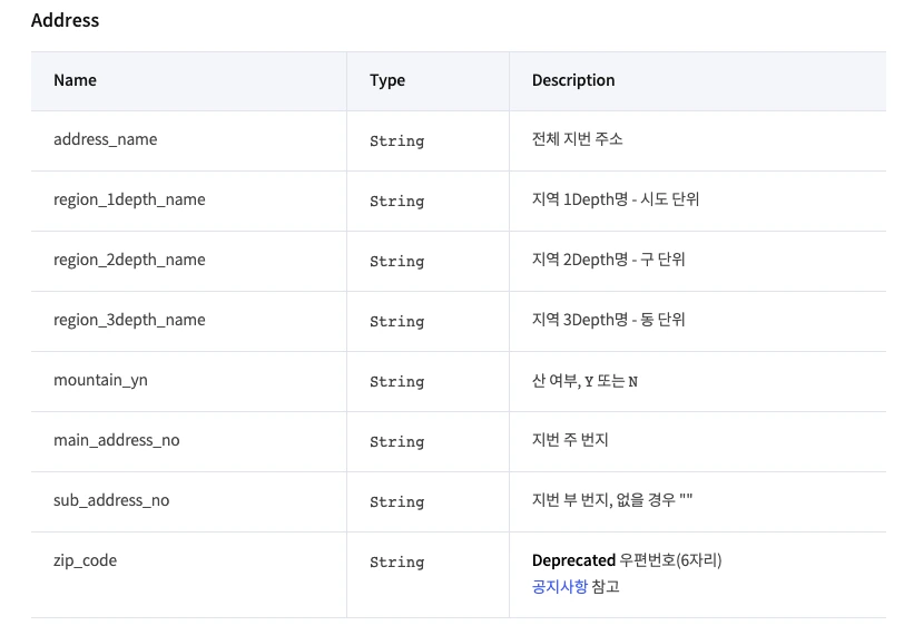 이 기능 중에서 <좌표로 주소 변환하기 기능> 좌표 정보의 지번 주소와 도로명 주소 정보를 반환하는 API를 좀 더 자세하게 알아보자.