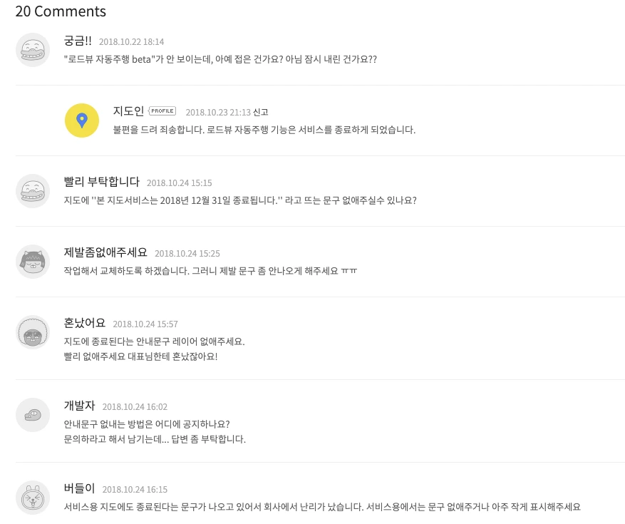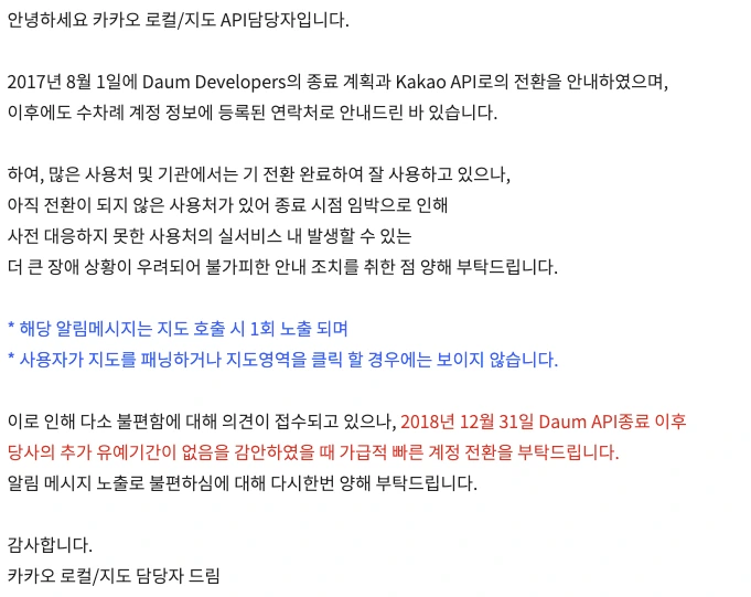 하지만 이런 OPEN API를 사용할 경우 문제가 발생하는 경우는 위와 같은 상황이다. 카카오가 다음을 인수하고 나서 다음에서 제공하던 API가 모두 카카오의 API로 바꾸게 된 것이다. 이때 카카오 측에서 바로 API에 종료 문구가 보이도록 표기해버리는 바람에, 다음 지도 API를 사용하고 있던 많은 서비스들이 난감한 상황에 처했다고 한다. 다음 지도 종료 안내 문구를 앱 서비스 종료로 착각해서 문의하는 고객들이 많아져 불편을 겪었다고 한다. 이처럼 OPEN API를 배포하는 측에서 내리는 결정에 따라 이를 사용하고 있던 다른 서비스들이 피해를 보거나 불편한 상황이 생길 수가 있다.