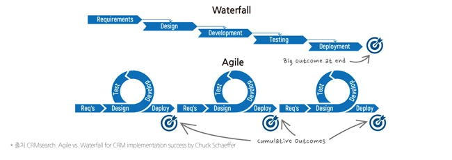 개발 방법론에는 워터폴(waterfall)과 애자일(Agile) 방법이 있다. 워터폴은 폭포처럼 위에서 아래로 제품을 스스로 정하고 고객 테스트 없이 팀, 이해관계자들끼리의 결정만으로 제품 개발 후 시장에 내놓는 전략이다. 애자일은 긴민함, 민첩함 이란 뜻처럼 아주 작은 핵심 요소만으로 제품 혹은 샘플을 만들어서 소비자 반응을 확인하고 점점 살을 붙여 나가는 방식을 뜻한다. 둘 중 무엇이 더 나은가라는 물음에는 정답이 없다. 둘 중 우리 팀과 더 잘 맞는 개발 방법론이 맞는가를 고민하는 것이 정답이다. 두 방법론 모두 장단점이 분명하기 때문이다.