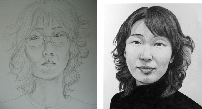 기초수업에서 배운 대로 명암과 형태를 격자 나누기로 세분해서 그렸습니다. 그런데도 원하는 그림이 나오질 않았어요. 자연스럽지 못한 명암과 선, 거기다 비대칭 얼굴까지 마음에 드는 게 하나도 없었어요. 세부적인 표현에 집중하다가 전체적인 균형이 깨지기도 했지요. 뭔가 부자연스러운 그림이 만족스럽지 못했어요.