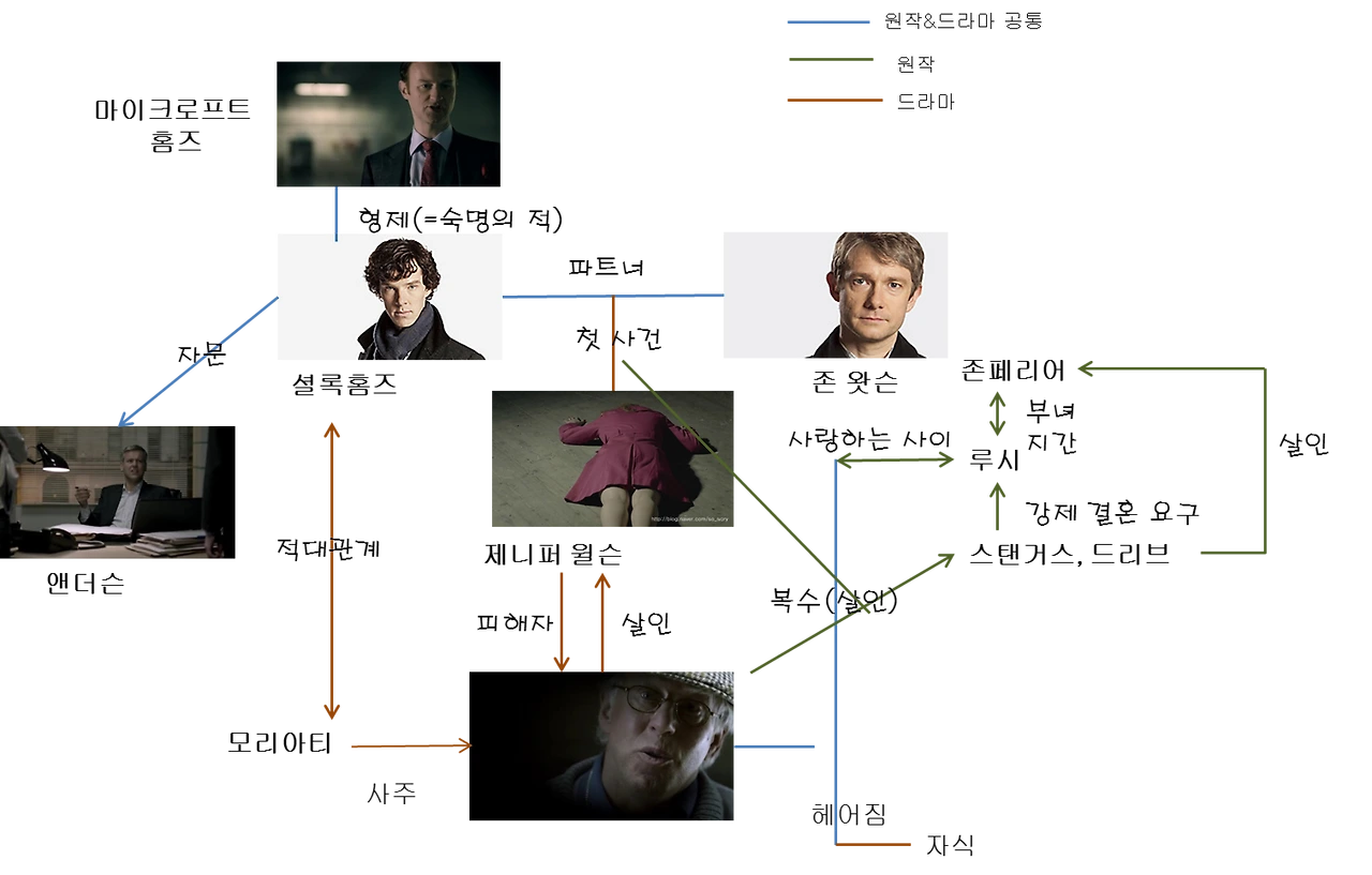 그랬다. 나는 영드 <셜록>에 빠진 나머지 발표 피피티에 인물관계도를 한땀 한땀 그려넣었다. 역시 쓸데없는 행동을 할수록 덕후력이 증가하는 것 같다. 사진을 넣은 것도, 딱히 큰 의미는 없다. 나처럼 셜록홈즈를 영드 <셜록>으로 입문하는 사람도 분명 있을 것이다. 그래도 첫번째 에피소드 [주홍색 연구]만은 읽어보면 좋겠다. 드라마가 세심하게 현대적으로 각색했다는 것을 느낄 수 있다. 먼저 제목 자체가 각색되었다.
