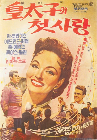워낙 오래된 작품이라 영화 내적인 재미보다는 외적인 재미가 흥미로웠다. 영화 포스터만 봐도 흥미롭다. 영화의 원제는 <The stdent prince>다. 남녀 주인공이 뮤지컬 드라마임을 알리듯 나란히 노래를 부르고 있다. 반면 한국판 영화의 제목은 <황태자의 첫사랑>이다.