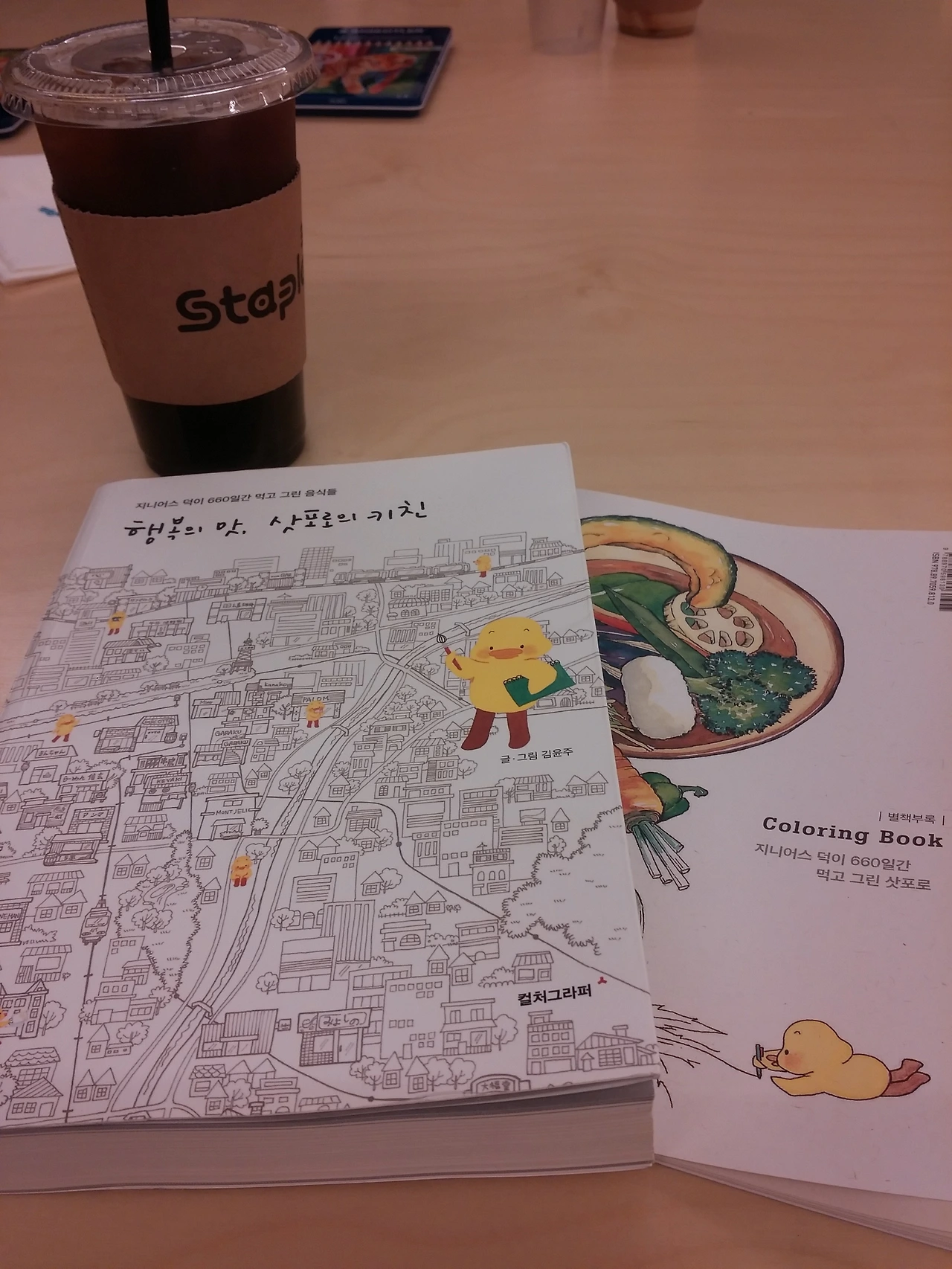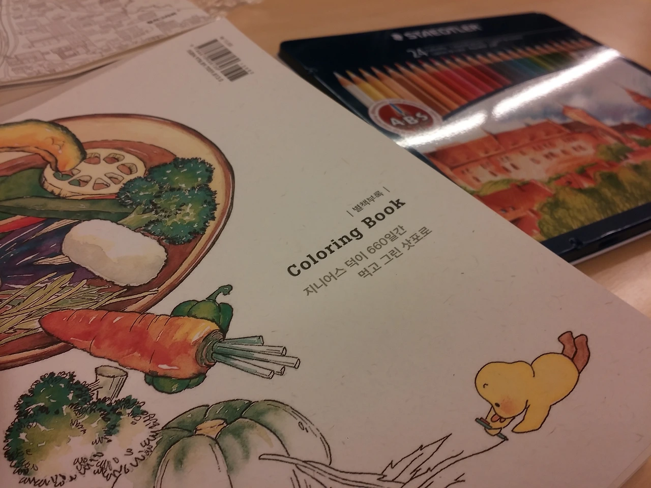 사진에서 보다시피 한정판으로 Coloring Book이 나왔다. 색이 안 칠해져 있는 부분에 컬러링을 해도 되지만, 책의 두께도 그렇고 새 책에 감히 색을 칠하기 쉽지 않다. 그러나 한정판 컬러링북은 얇아서 컬러링이 수월하다. 시중에 나와있는 어려운 컬러링 북이 아니라서, 어린 아이부터 어른들까지 할 수 있는 수준이다. 그러나 처음 해본 내게는 꽤 어려웠고, 음식 색감에 대해 무지해서 그런지 좀처럼 예쁘게 완성되지 않았다. 작가님은 본격적인 컬러링 북 작업을 위해 지금 삿포로에서 작업 중이시라는데, 어떤 컬러링 북이 완성될지 기대가 된다.