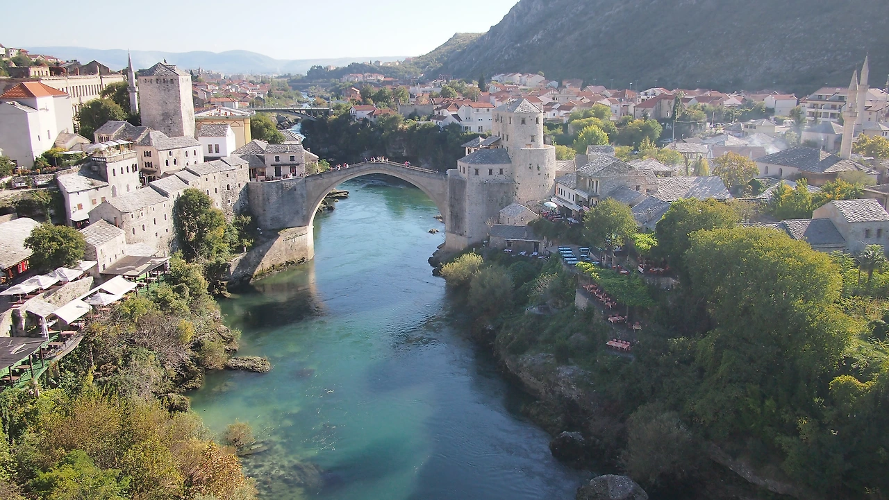 모스타르의 명물인 다리. 네레트바 강 바로 위 다리를 지켰던 "다리 파수꾼들"을 뜻하는 mostari로 도시 이름이 지어졌다니, 명물은 명물이다. 가장 이곳의 사진을 잘 찍을 수 있다는 곳에서 바라본 다리는 두 마을을 잇는 아름다운 풍경을 보여 주었다. 그러나, 불과 20여 년 전인 1993년 보스니아 내전으로 다리와 옛 도시들이 파괴되었고, 후에 다리를 재건했다고 한다. 이 다리를 건너는 관광객들로 북적이는데, 대리석으로 길이 미끄럽기 때문에 조심히 걸어야 한다.