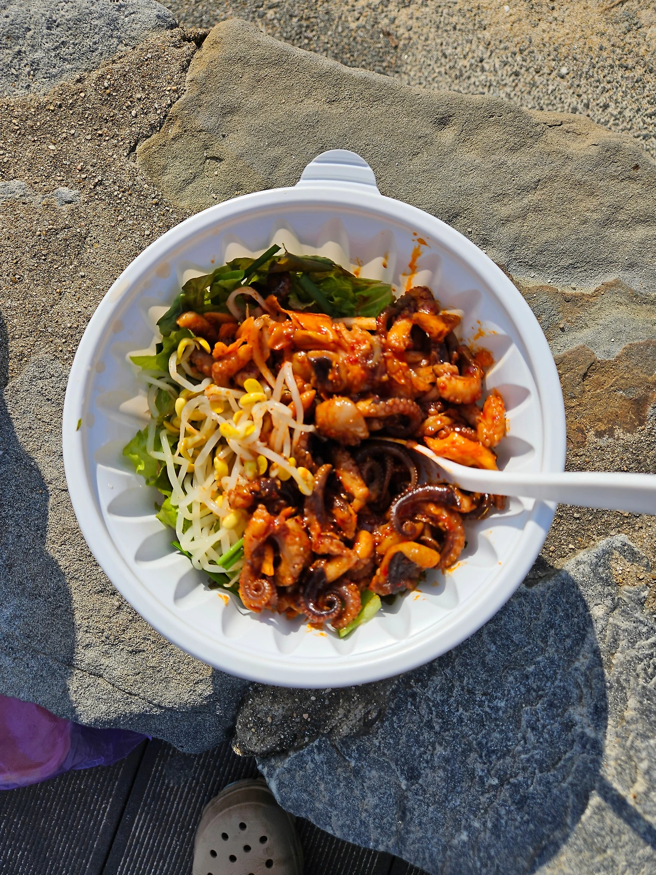 맛있는 쭈꾸미 볶음을 안목해변에서 먹으면서