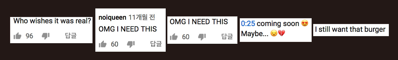 하지만 아래의 캡처한 댓글 창에서도 볼 수 있듯이, 이 가짜 햄버거를 정식 출시해달라고 말할 정도로 네티즌들의 반응은 뜨겁다.
