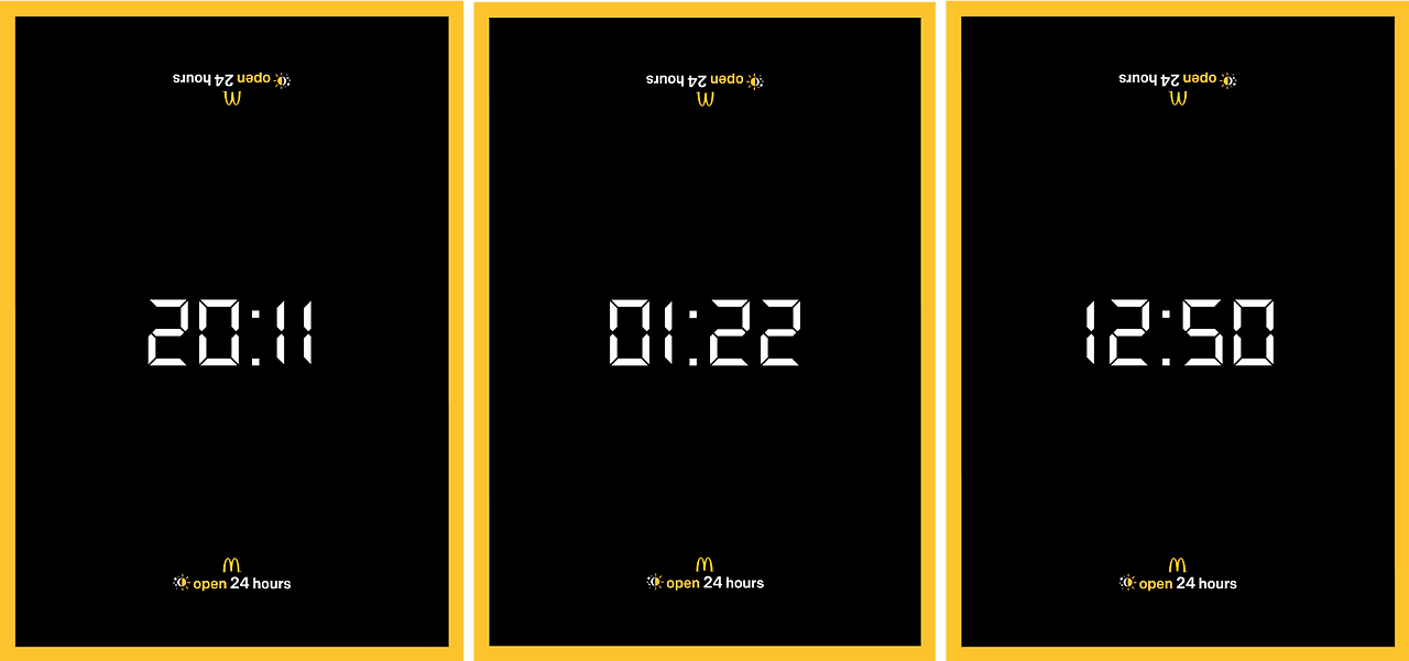 12:50으로 읽든 05:51분으로 읽든, 위아래 화면을 돌려서 시간을 읽어도 괜찮다. 맥도날드는 항상 24시간 열려 있기 때문이다. 맥도날드의 24시간 오픈을 단순하면서도 기발하게 표현한 광고라고 할 수 있다.