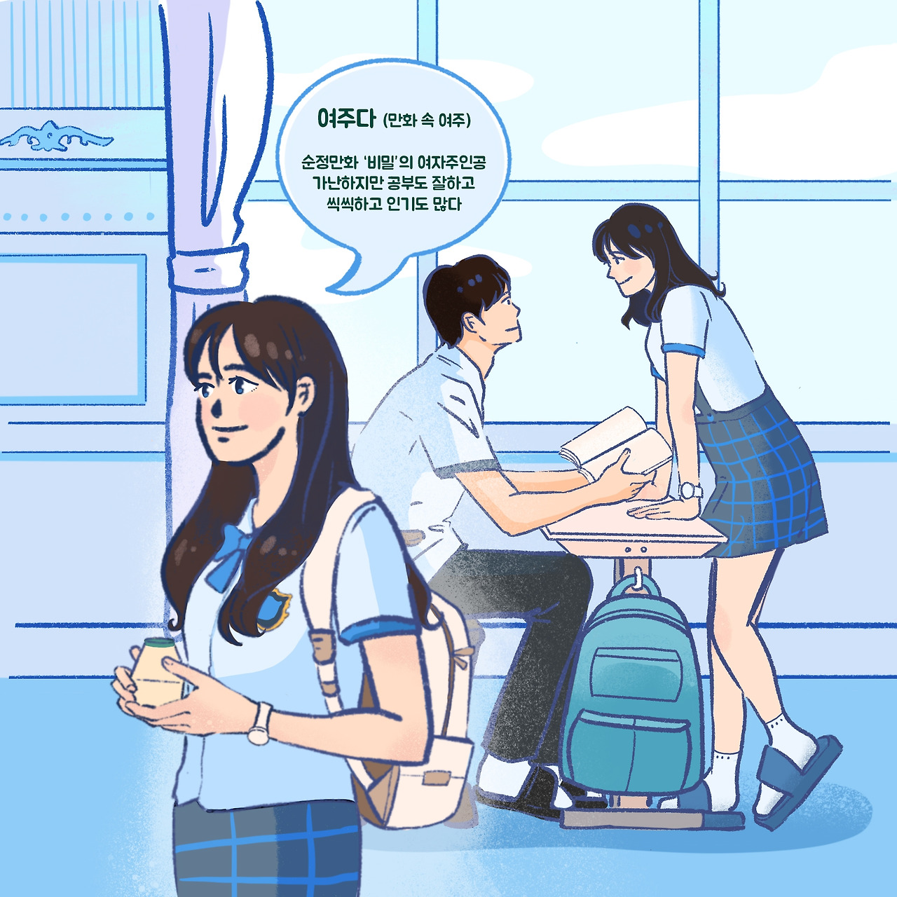 순정만화 ‘비밀’의 주인공, 여주다와 같은 학교에 다니는 그들은 조연이다. 주연인 여주다의 설정값에는 이것저것 내용이 많다. 가난하지만 씩씩하고, 공부도 잘해 인기가 많다. 또한, 숨겨져 있는 깊은 사연이 있으며 다른 캐릭터와도 긴밀한 관계성을 가지고 있다.