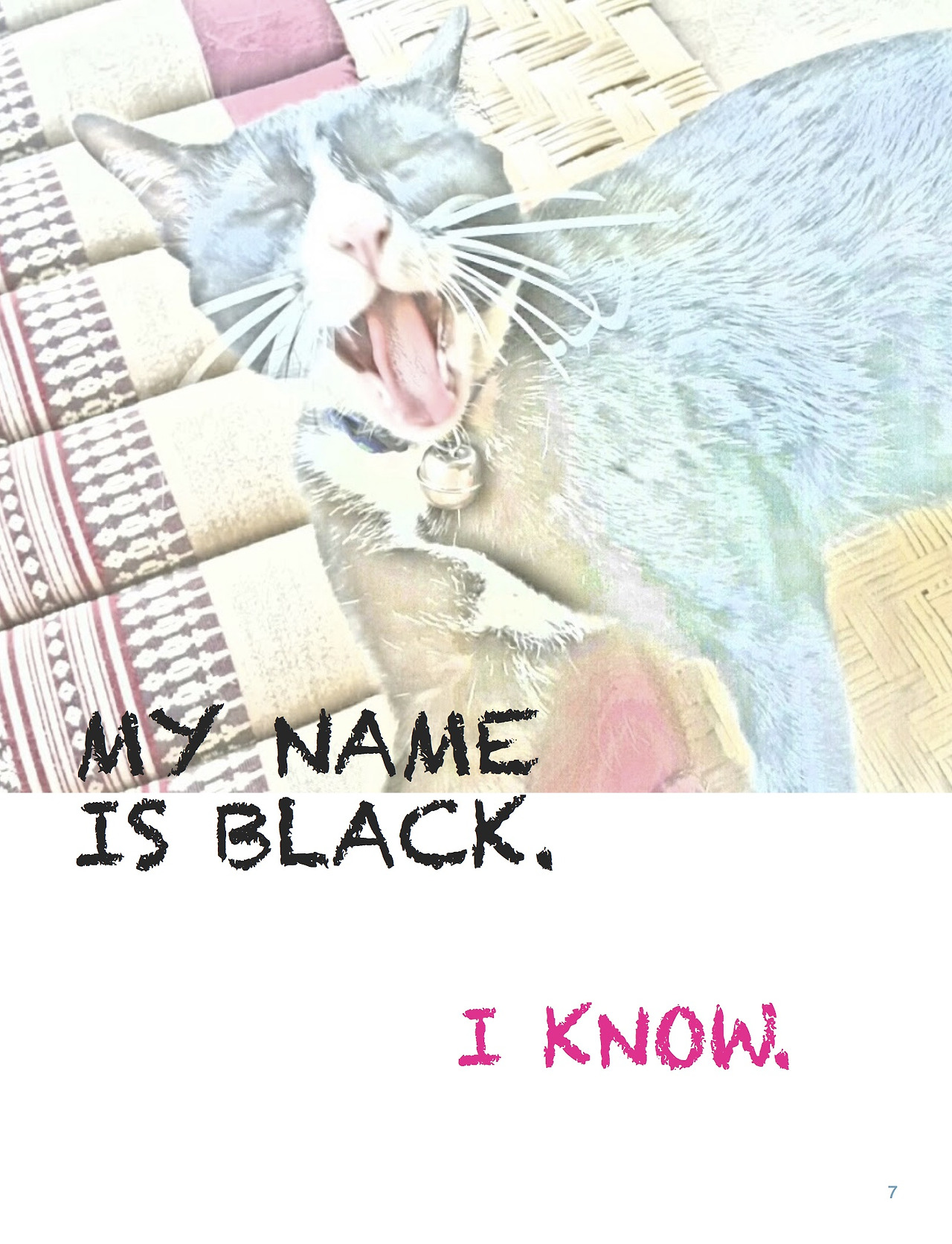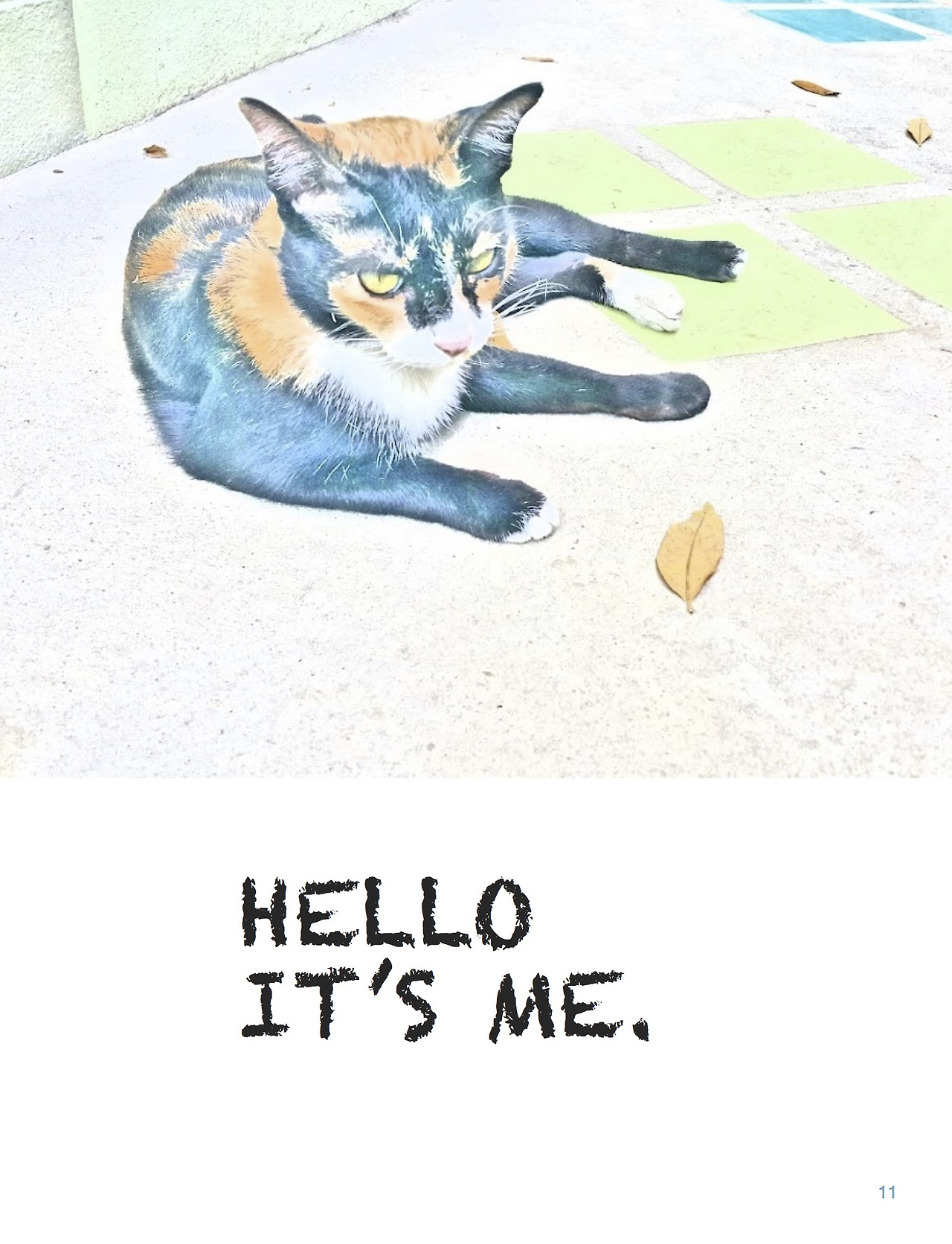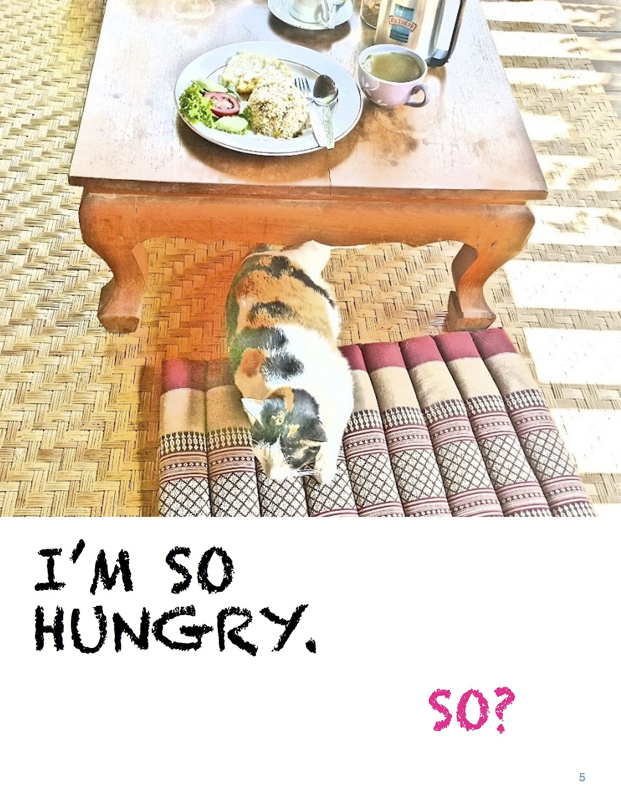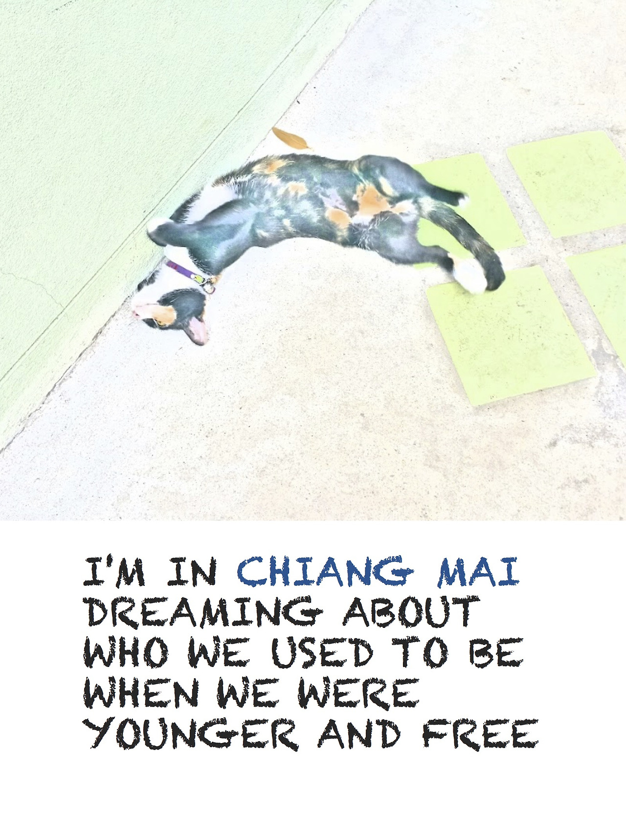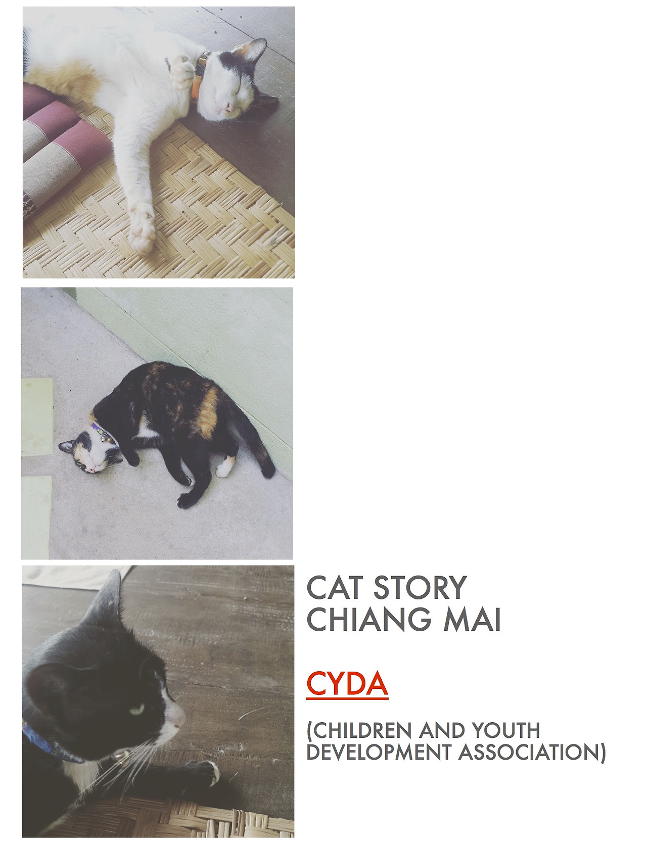 - 고양이들은 CYDA에서 키우고 있습니다. 저는 현재 치앙마이 CYDA 게스트하우스에서 머물면서, 고양이에 대한 작업물을 하면 좋겠다고 생각했습니다. 결과물을 여기에 있는 사람들에게 보여주기 위하여 영어로 제작하게 되었습니다. 영어를 잘 못해서, 짧은 영어가 주로 사용되었습니다. 다만, 여기에 있는 분들도 영어를 잘 못한다는 게 함정이기는 한데, 그렇다고 태국어로 책을 작업할 수가 없어서 일단은 영어로 준비했습니다. 여기를 떠나기 전에 그들에게 주려고 선물용으로 만든 책입니다. 이곳에 있는 고양이들의 일상을 공유합니다.