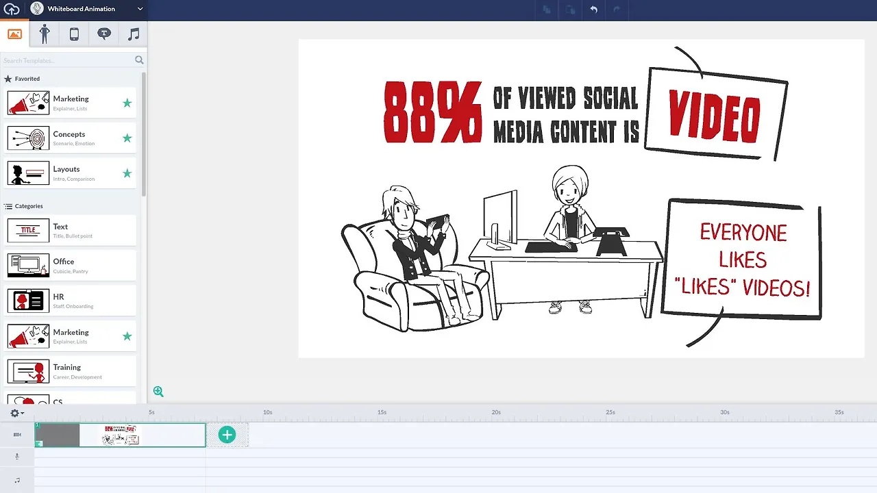 왼쪽 사이드바에 있는 다양한 템플릿을 통해 비교적 쉽게 비디오를 제작할 수 있다. 디자인적인 감각이 없더라도, 이미 만들어져 있는 템플릿을 활용하면 금방 1분짜리 비디오를 만들 수 있다.