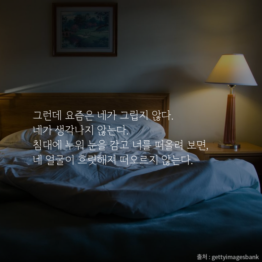 그런데 요즘은 네가 그립지 않다. 네가 생각나지 않는다. 침대에 누워 눈을 감고 너를 떠올려 보면, 네 얼굴이 흐릿해져 떠오르지 않는다.