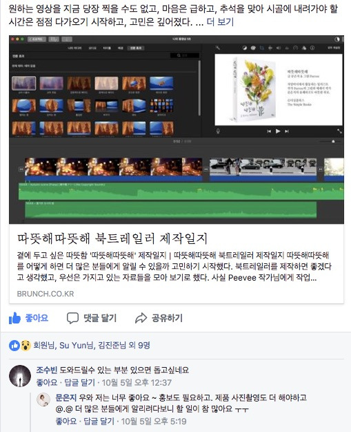 따뜻해따뜻해 북트레일러 제작일지 글을 쓰고 얼마 되지 않아 페이스북에 댓글이 하나 달렸다. 따뜻해따뜻해 프로젝트를 도와주겠다는 그 말에 너무 고마웠으나 지나가는 말이 아닐까 생각되어 또한 망설이기도 했다. 혼자서 모든 것들을 하려다 보니 힘이 조금 부치는 시기였다. 지나가는 말이라도 고마웠다. 답글을 달았다. 도와주신다면 너무 좋을 거 같다는 진짜 진심 담은 답변.