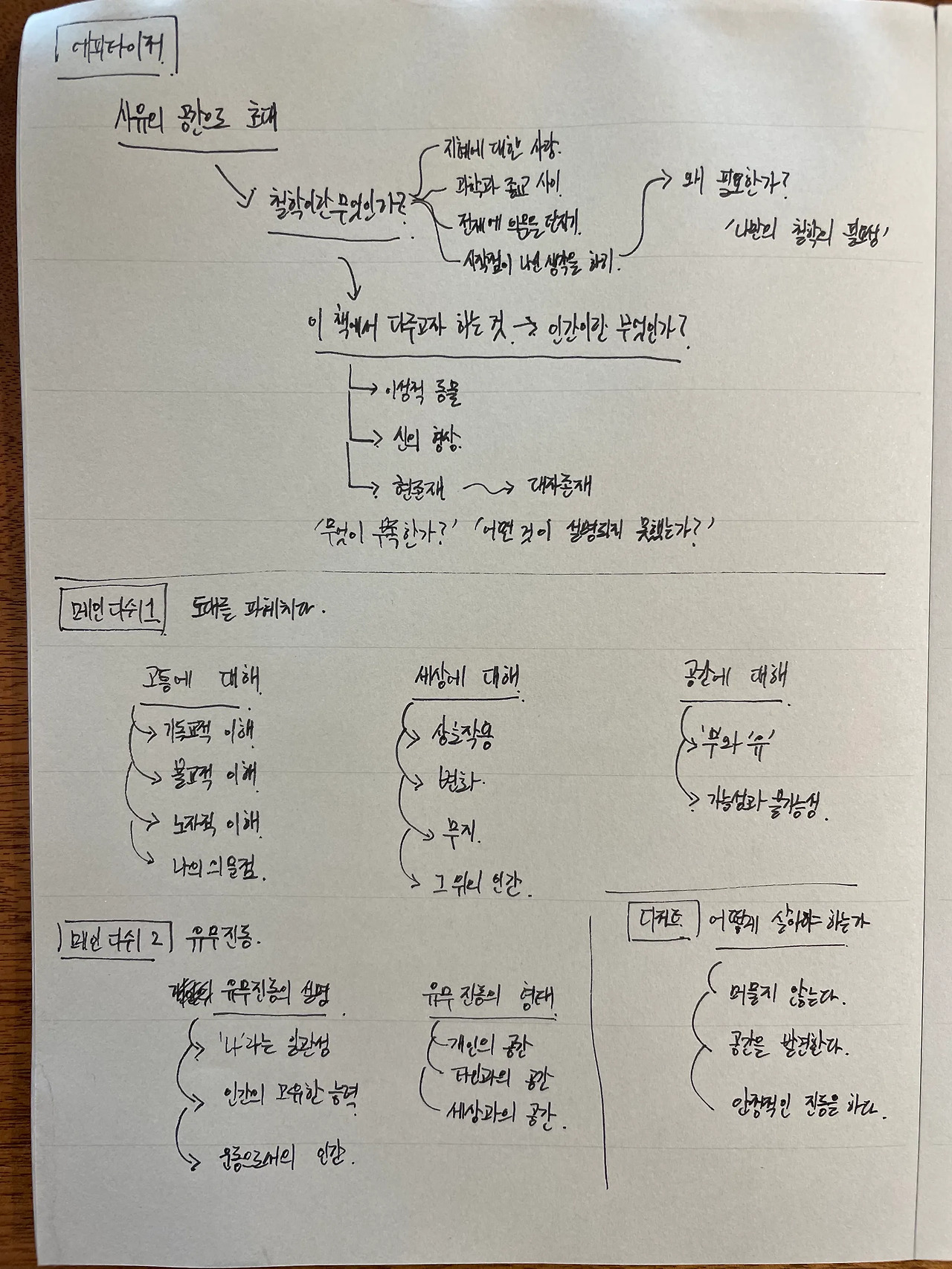 그러나 단순히 키워드만으로는 부드러운 글의 흐름을 만들어내기 어렵다는 한계도 있었습니다. 머릿속의 생각을 온전히 표현하려 해도 글 전체에 내 의도를 모두 담아내기엔 한계가 있었지요. 그러다 보니 어딘가 부족하다는 느낌이 들었고, 이를 보완하기 위해 저는 그림을 그리기 시작했습니다. 회사에서 글이나 말로 전달이 어려울 때, 화이트보드 앞에서 그림을 그리며 설명했던 경험이 큰 도움이 되었던 것입니다. 나와 소통하기 위해 그림을 활용하는 것도 좋은 방법임을 깨달았습니다.