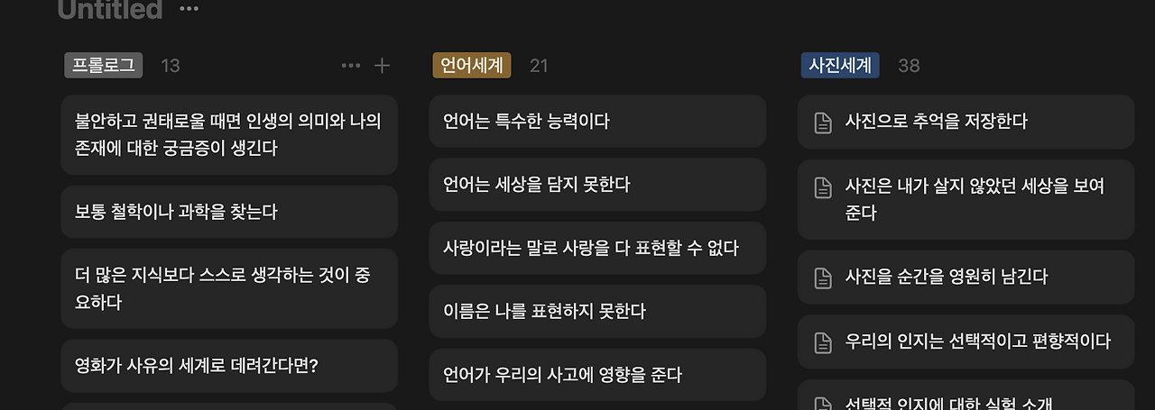 이 문제를 보완하기 위해 저는 글의 전체 흐름을 미리 구상하기 시작했습니다. 영화나 음악처럼 작품에도 어느 정도 분량의 제한이 있듯, 하루에 쓸 글의 양을 정해두었습니다. 저는 "오늘은 20문단을 쓰자"라는 목표를 세우고, 글을 쓰기 전 노션의 칸반 보드를 활용해 20개의 카드를 만들었습니다. 각 카드에 해당 문단에서 다룰 내용을 간략히 적어두자, 전체적인 흐름이 한눈에 들어오기 시작했습니다.