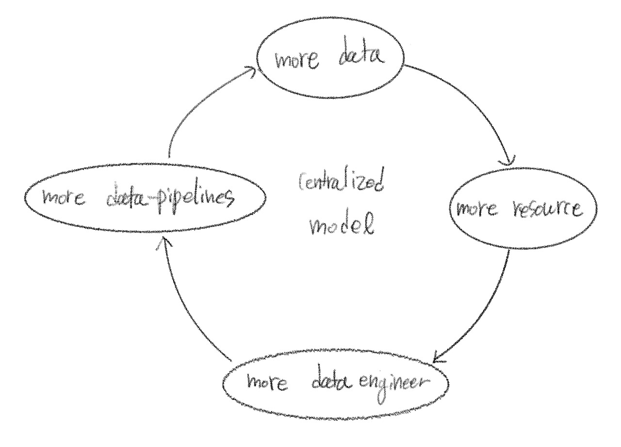 하지만 기업의 성장 속도가 충분히 빠르다면 데이터 엔지니어의 증가 속도는 절대 기업과 서비스의 성장 속도를 따라잡지 못한다. 게다가 점점 데이터가 각 팀의 각 엔지니어의 손을 떠나가면서 데이터를 신뢰하기 어려워진다. 데이터를 신뢰하기 위해서 중앙화 된 데이터 엔지니어들에게 데이터에 대한 질문을 많이 하게 된다. 그렇게 데이터 관련 의사소통이 모두 데이터 엔지니어에게 몰려가면서 완벽하게 데이터 병목 현상을 만들게 된다. 데이터는 점점 더 많아지고 데이터 엔지니어는 점점 더 많아지고 데이터 파이프라인도 점점 더 많아지지면 우리는 점점 더 느려지고 데이터를 더 신뢰하기 어려워진다.