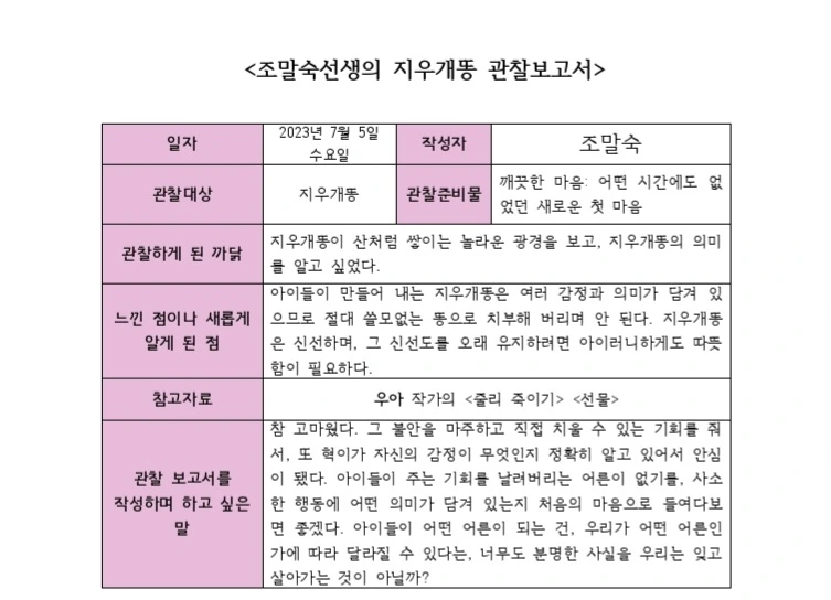 애꿎은 책상은 지우개똥 만들기를 돕고 남들에게 보이지 않았던 얼룩을 그 작은 손 덕분에 지우고 있었다. 아이들이 몰래 그렸을 책상 위의 수많은 감정들이 그 작은 손에 힘차게 지워지고 있었다.