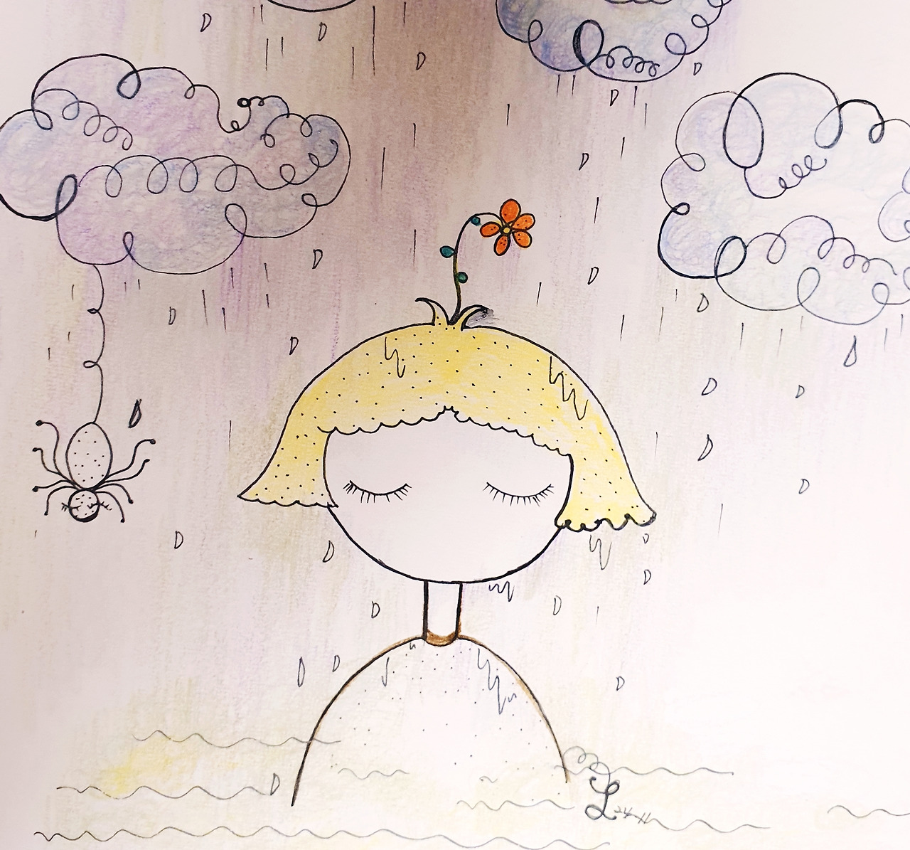 빗방울 사이로 손 하나가 불쑥 껴들었어요.