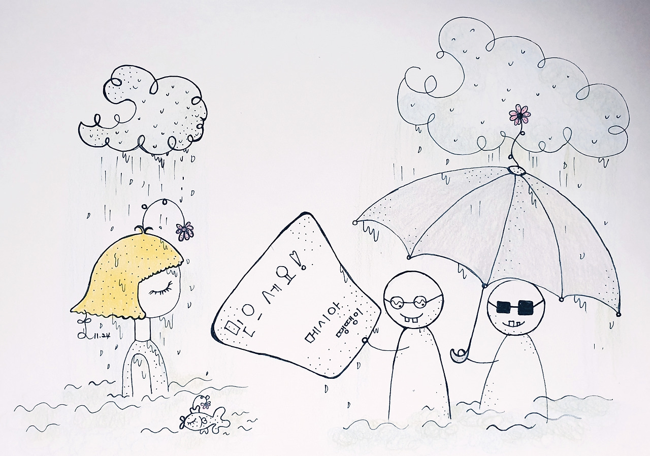 우리의 말숙은 무거운 구름에서 터져 나오는 빗방울 속으로 점~점~ 점~~~더 깊이 침몰해 갔어요.