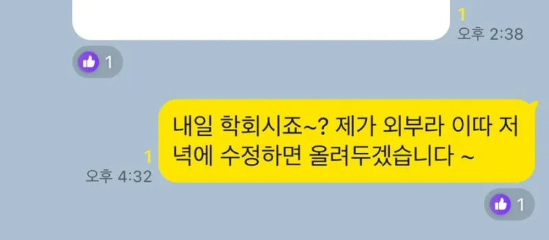 그래서 저녁 9-10시쯤 집에 돌아올 듯싶어 우선 ‘저녁에 돌아오면 해드려야겠네’ 란 생각으로 저녁에 수정해서 올려두겠다는 톡을 올려두었다.