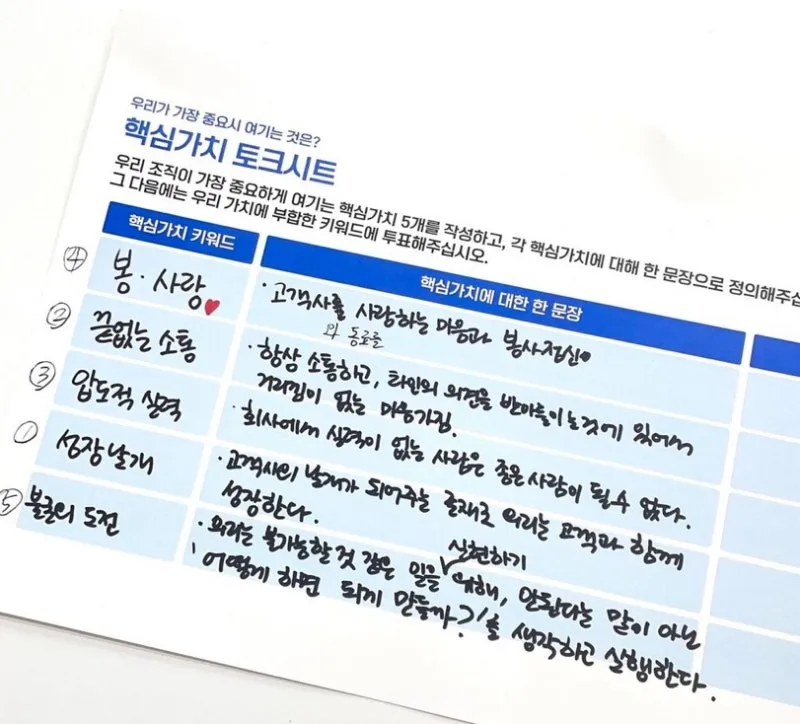 팀원들과 다 함께 애드리절트 마포지사의 핵심가치 수립 시 압도적 실력 : 회사에서 실력이 없는 사람은 좋은 사람이 될 수 없다는 단호한 가치를 세우기도 했다. (팀원들도 나와 비슷한 가치관을 가지고 있기에 나온 핵심 가치 아닐까)