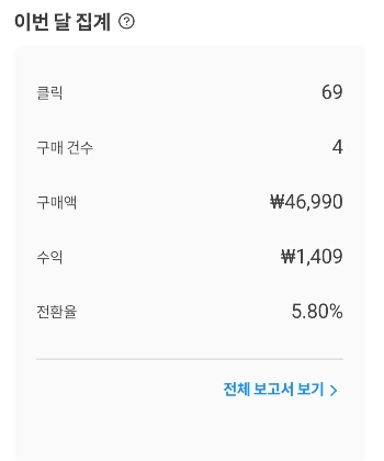 결과는 클릭 69회 구매 4회 수익 1,409원 한 달해서 캔커피 사 먹을 수 있는 돈을 벌었다. 디지털 노매드로 살기 위해서 저는 0보다는 1이라고 생각한다. 내가 포기하지 않으면 콘텐츠는 쌓인다. 처음에는 한 곳에서 사람들이 들어왔다면 3개월 후에는 더 다양한 곳에서 사람들이 들어올 것으로 기대한다.