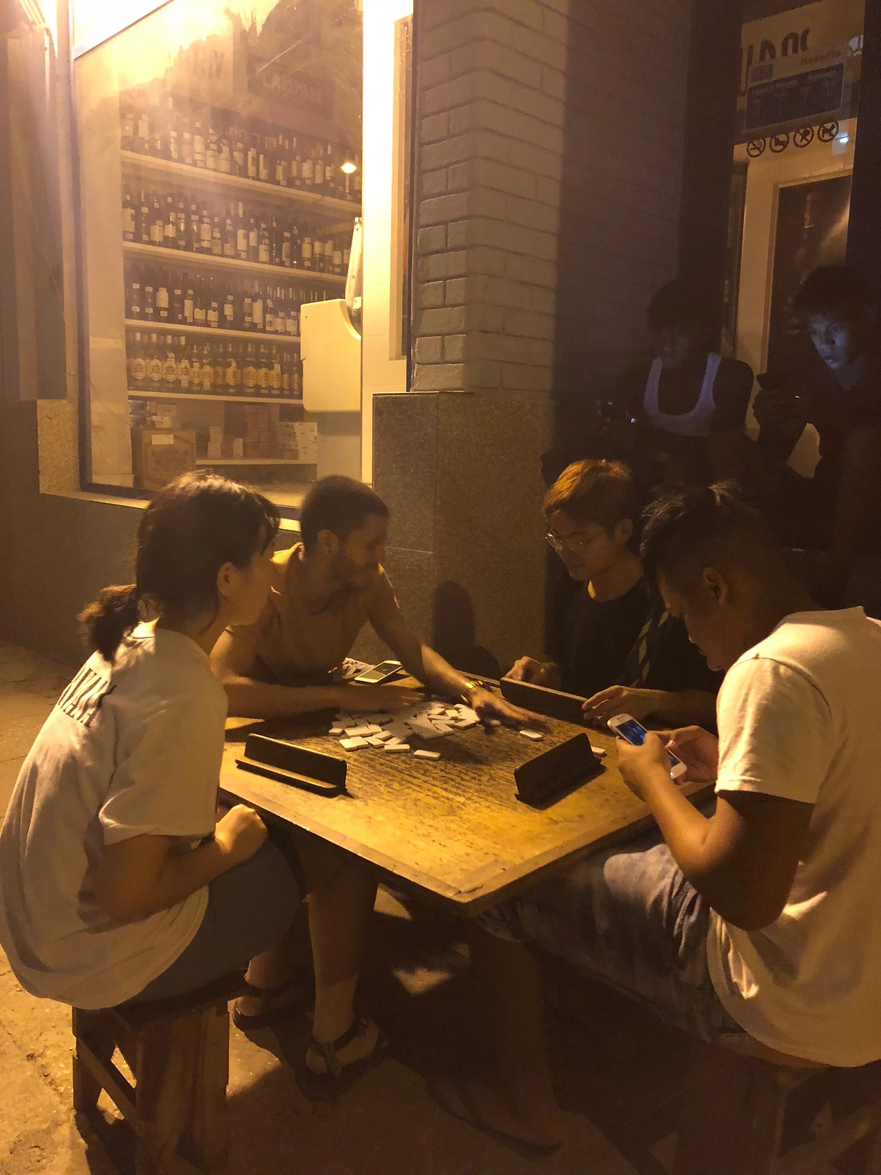 쿠바를 떠나기 전 날 새벽 1시에 길을 걷고 있었다. 어디선가 레게톤 음악이 흘러나왔고, 문이 닫힌 술집 앞으로 젊은이들이 도미노 판을 벌이고 있었다. 이 네모난 판자에는 다리가 없다. 게임에 참여하는 이들의 허벅지가 곧 받침이다. 우리는 그들 옆에 서서 한참을 바라봤다. 판이 끝나자 "같이 할래?" 라고 먼저 제안이 온다.