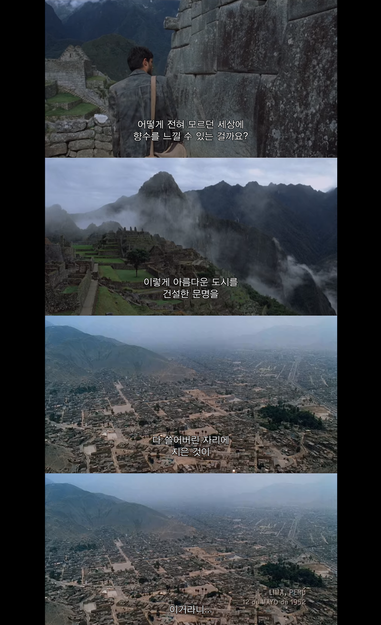 안데스와 아마존은 백인들이 사는 풍요롭고 거대한 아르헨티나와 달랐다. 잉카인들은 지진에도 무너지지 않는 벽을 설계했고 낯설도록 아름다운 공중도시 마추픽추를 만들었지만, 총이 없었다. 스페인군은 총이 있었다. 원주민들은 대부분 몰살당했고, 살아남은 후손들은 본인들의 땅에서 쫓겨나 대륙의 최하위 계급으로 전락했다. 이런 현실을 마주하며 두 사람의 내면은 조금씩 변해간다.