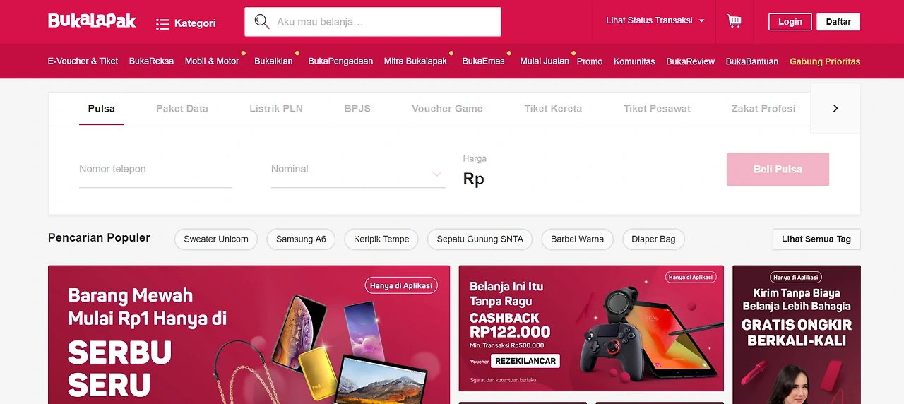 싸다. 싼게 최고 장점. 여기도 인도네시아 국기를 연상시키는 붉은색이 테마다. 그리고 눈치챘겠지만 인도네시아 온라인 마켓플레이스는 이렇게 첫 화면에 Pulsa(통신요금), Listrik(전기세) 등을 강조해 놓은 점이 특이하다.