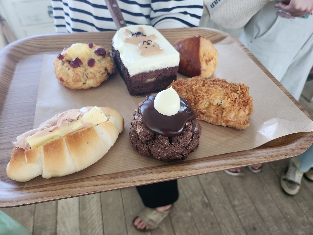 우리는 당장 선택해야 했다. 사람이 가득 찬 베이글 카페 앞에서 1시간이 넘도록 기다렸다가 아침을 먹을 것인지, 아니면 바로 옆 베이커리 카페(카페 레이어드, 제주 제주시 구좌읍 동복로 85 주 1동 1층)를 기다리지 않고 바로 들어갈 것인지. 당연히 우리의 선택은 후자였다. 아무래도 상관없었다. 그게 베이글이든 소금빵이든 우리 가족은 당장 아침을 먹어야 했기 때문이다. 카페를 들어서자마자 계산대 너머로 제주 바다가 한눈에 보였고, 강렬한 여름 태양 빛을 받은 바다의 물결이 가게 안까지 환히 비추고 있었다. 곧이어 우리의 시선은 다양한 빵으로 향했다. 소금빵과 스콘, 조각 케이크를 주력으로 파는 카페였다. 자리가 협소하지만 다행히 앉을자리가 있었고, 몇 가지 빵을 고른 뒤, 어른이 마실 차가운 커피와 함께 간단히 아침을 해결했다. 식사 막바지에는 베이커리 카페에도 사람이 제법 북적였다. 우리는 더 혼잡해지기 전에 서둘러 가게를 나섰고, 숙소로 돌아왔다.