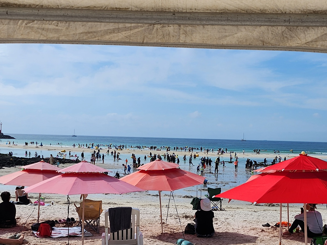 살인적인 더위가 기승을 부리는 2023년의 제주 여름. 우리는 한마음으로 해수욕장을 외쳤다. 친구들의 선택은 ‘김녕 해수욕장’. 우리 가족은 일전에 다녀왔음에도 개의치 않았다. ‘배려의 여행’을 마음먹은 뒤였고, 우리 가족은 남는 시간 동안 언제든지 다른 해수욕장을 다녀올 수 있기 때문이었다. 부지런히 아침을 챙겨 먹고 물놀이 장비를 챙긴 뒤 역시 두 팀은 자차로, 나머지 한 팀은 택시를 타고 이동했다.(한 명의 친구는 일정상 오전에 집으로 돌아갔다.) 방학 기간인 탓에 가족 단위의 여행객들이 많았다. 파라솔과 평상 중 고민 끝에 평상을 대여하기로 했고, 그마저도 딱 하나의 평상만 남아 있을 만큼 더운 여름의 제주 해수욕장에는 오전부터 사람들로 가득했다. 이번 일정에서는 어느 때보다 친구들의 도움이 절실했다. 다 큰 것 같지만 큰아이들도 분명 어른의 손길이 필요한 나이이다. 튜브를 챙겨 시원한 바다로 몸을 담그러 간 아이들과 친구들. 나 역시도 바닷속에 들어가 달궈질 대로 달궈진 몸을 식히고 싶었지만 현실은 그럴 수 없었다. 아쉽지만 평상에서라도 지낼 수 있음에 감사하며 아이들과 친구들이 노는 모습을 바라보았다. 꿈만 같은 시간. 무덥고, 진득한 피부에 까슬거리며 달라붙은 모래가 불편한 이 어려운 상황 속에서도 믿기지 않았다. ‘우리가 모두 제주에 와 있다니.’ 기적 같은 이 순간을 되새겼다.