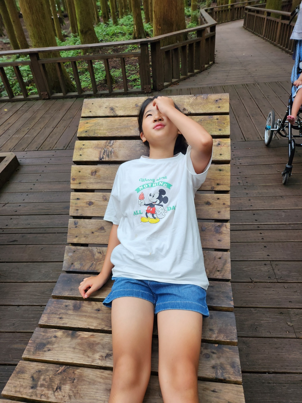 사려니숲길의 입구와 비자림 입구의 분위기는 사뭇 달랐다. 비자림의 경우는 주차장 공간을 따로 마련해 두었으며 본격적인 탐방 코스, 산책로가 나오기 전에 매표소를 포함한 이동 구간이 따로 있었던 것과는 달리 사려니숲길은 도로가에 주차구역이 일렬로 나 있고, 도로를 제외한 모든 공간이 숲이었다. 물론 매표소도 없었다. 또 다른 점은 비자림은 적토길인 반면, 사려니숲은 나무 데크로 땅 위에 또 다른 길을 만들어서 길지 않지만 휠체어나 유아차가 더 쉽고 편하게 이동할 수 있는 ‘무장애 나눔길’이었다. 사전 정보가 전혀 없는 상태에서 무작정 사려니숲길로 향했다. 유아차가 들어가지 못한대도 갈 수 있는 만큼만 가보자고 마음속으로 다짐한 터였다. 그러나 웬걸! 장애인과 같은 교통약자를 위한 길(무장애 나눔길)이 따로 마련되어 있는 것을 보는 순간 비자림에 이어 사려니숲마저 사랑하게 될 것만 같은 기분이 들었다. 덜컹거리지 않았기에 우아한 공작부인이 된 것 마냥 유아차를 밀며 사려니숲길을 거닐기 시작했다. 비자림에서도 느낀 바지만 아무리 뜨거운 볕도 울창한 숲 안을 들어선 순간, 언제 그랬냐는 듯 찌는 듯한 무더위는 사라지고 시원한 바람마저 온몸으로 느낄 수 있었다. 이 순간의 기분을 한 단어로 표현하자면 ‘황홀함’이었을 것이다. 가장 좋아하는 숲이라는 공간에서 힘들이지 않고 유아차와 함께 산책할 수 있는 이 순간, 바로 이 순간의 황홀함을 만끽하기 위해 어쩌면 제주도 한 달 살기를 다짐했는지도 모르겠다. 참 행복했다. 행복한 이 기분이 비자림에 이어 내 얼굴에 고스란히 드러났을까. 첫째가 말한다. “엄마, 왠지 엄마를 위해서 제주도에 온 것 같아.” 동시에 ‘나는 숲이 좋지 않아. 나는 바다에서 물놀이하는 게 더 좋은걸?’이라고 우회적으로 말하는 듯했다. 내심 생각했다. ‘너희들만 행복하면 되겠니? 엄마도 행복해야지?’ 그리고 이어 말했다. “그럴 리가. 여기 너무 좋지 않니? 엄마는 바람이 불어 덥지 않아 너무 좋은데?” 가벼운 우스갯소리를 나누며 걷고 또 걸었다. 길 중간에 나무로 된 선베드에 누워 하늘을 바라보기도 했다. 키 큰 나무가 얼마나 울창한지 하늘이 좀체 보이지 않았다. 한 폭의 그림을 보는 것만 같았다. '이런 순간을 사랑하는 아이들과 나눌 수 있다니. 이 얼마나 행복한가.' 물론 아이들은 엄마만큼 즐겁진 않았겠지만 분명 행복해하는 엄마의 모습을 보며 덩달아 아주 조금은 행복해졌을 것이라 생각한다. 지난 5박 6일 동안 함께 하는 즐거움과 더불어 '배려의 여행'을 즐겼다면 앞으로의 여행은 '자유의 여행'이 되지 않을까 기대해 본다. 물론 오늘처럼 엄마의 의견이 전적으로 반영된 여행지가 아닌, 아이들의 의견을 수렴해 그때그때 원하는 여행지를 갈 수 있는 자유. 그 자유를 만끽하는 여행이 될 것이다. 그런 기대와 설렘이 더해져 사려니숲길에서의 시간은 30일간의 여행동안 유독 기억에 남는 한 순간으로 손꼽힌다. 유아차가 갈 수 있는 길은 다 걸었을까. 우리는 다시 숙소로 돌아가기로 했다. 더 머물고 싶었지만 셋째의 수유 시간과 더불어 컨디션도 생각해야 했기에 이쯤에서 마무리하고 발길을 돌렸다. 돌아가는 길목의 끝자락에서 한 여성 연주자가 버스킹 공연을 하고 있었다. 함덕에서도 그러했듯이 사람이 모이는 장소에는 자연과 더불어 좋은 음악을 들려주는 예술가가 있었다.(검색해 보니 팬플룻 연주가 ‘서란영’님이셨다.) 사려니숲과 너무 어울리는 팬플룻 소리에 더 머물다 가고 싶었지만 숲길을 거니는 동안 듣게 된 것만으로도 오감이 풍족한 산책을 즐길 수 있었기에 이쯤에서 아쉬움을 달래기로 했다.