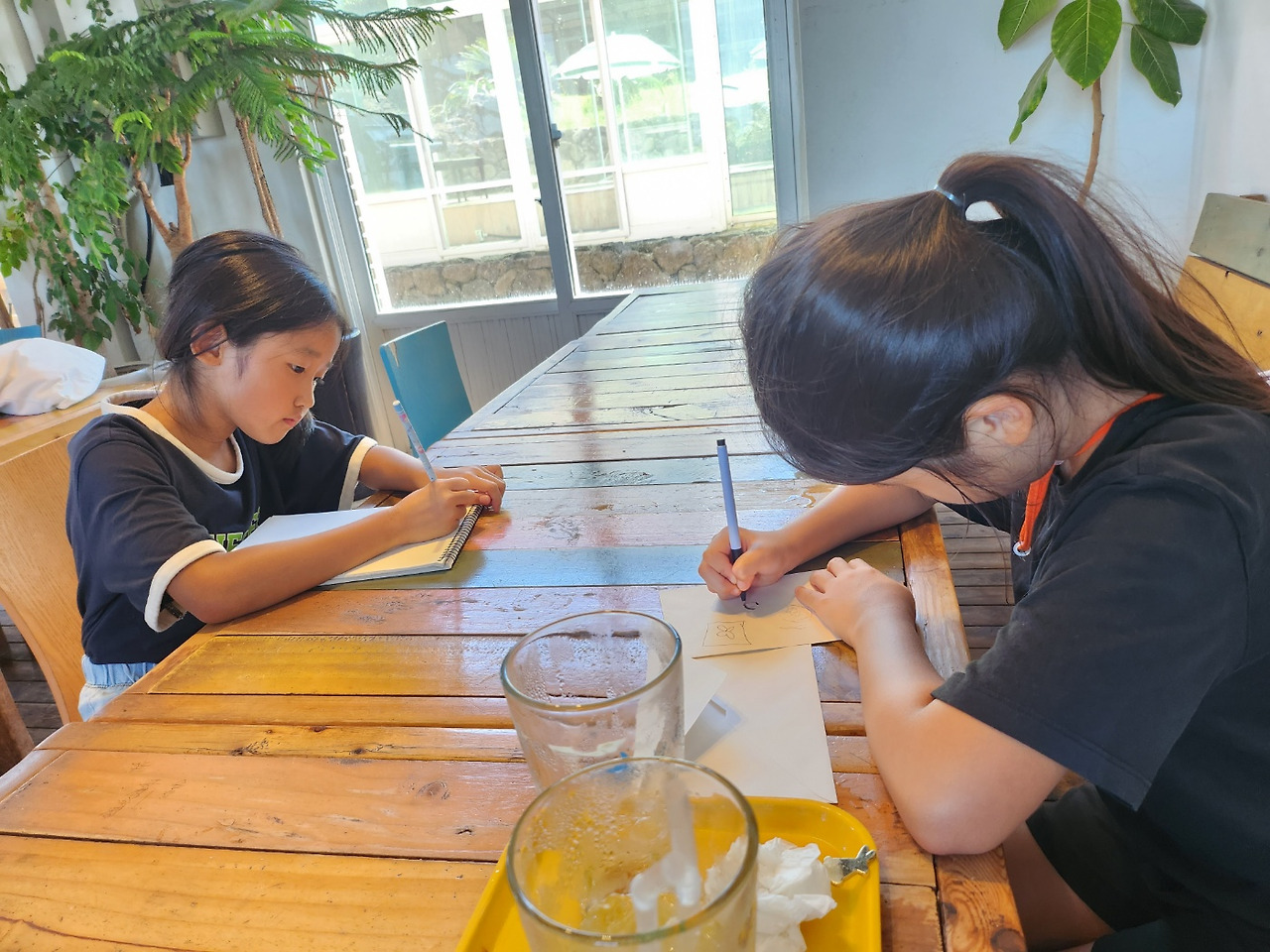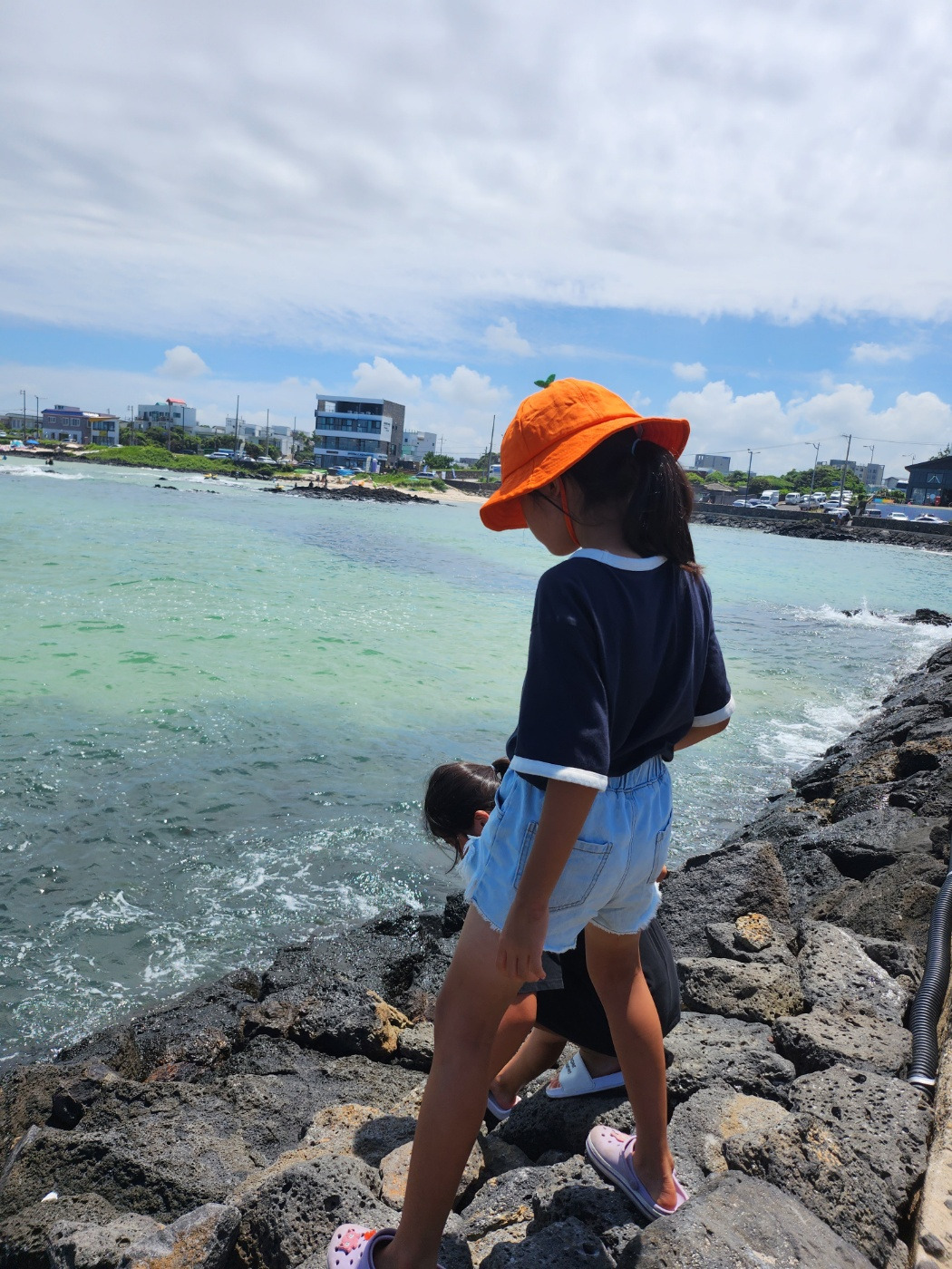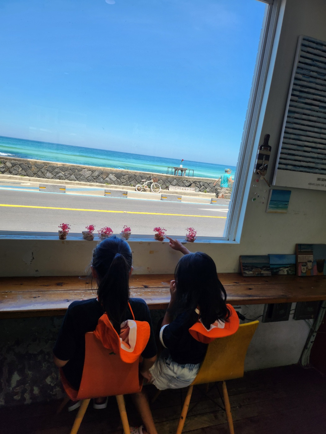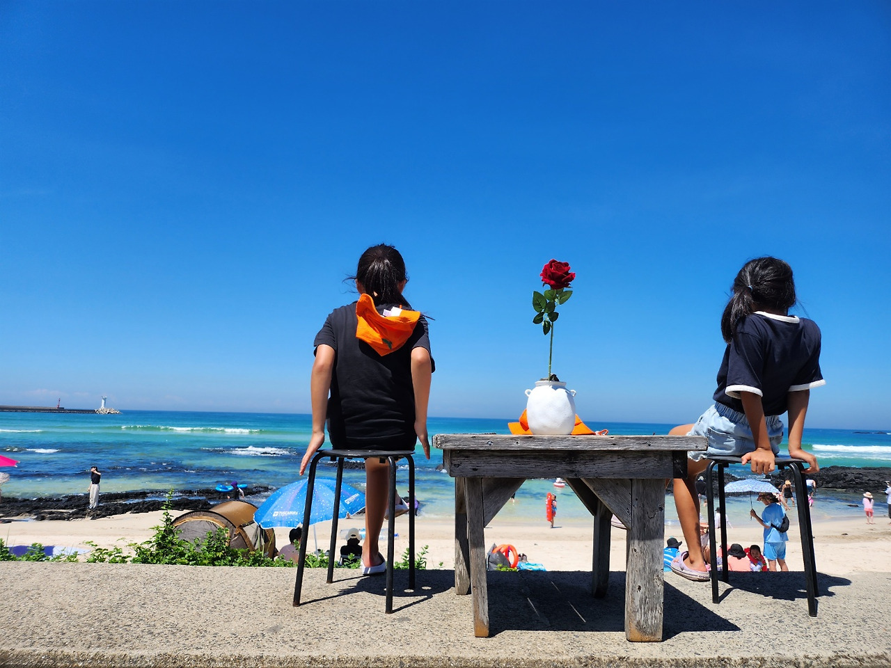 그다음 여행지는 점심시간에 맞춰 ‘세화민속오일시장(제주 제주시 구좌읍 세화리 1500-44)’. '동문 시장'이나 '서귀포 시장'처럼 상설 시장이 아니기에 더욱 궁금했고, 허기가 진 터라 곧바로 점심부터 먹을 요량이었다. 우리는 장애인 주차장에 무사히 차를 주차하고 시장에 들어섰다. 5일장답게 사람들로 가득했다. 맛집을 찾아간 것이 아니기에 우리는 보이는 대로 들어가 점심을 해결했다. 검색이라도 하고 오면 좋았으련만 밥을 먹기 위해 시장을 간 것은 아니었기에 일단 시장 입구의 첫 번째 집에 들어갔다. 메뉴는 분식. 떡볶이, 어묵 등을 파는 곳으로 한 편에 두세 개의 식탁이 놓여있는 아담한 노점상이었다. 말 그대로 시장의 분위기가 물씬 풍겨졌다. 우리 가족은 설레는 마음으로 좁은 자리에 셋째의 유아차를 대고 자리를 잡았다. 대형 선풍기도 함께 있어 더위를 식히기에도 그만이었다. 때마침 셋째도 수유 타임이 곧 찾아오기에 우리는 기대만큼 즐길 겨를도 없이 급하게 허기를 채우고 자리를 비웠다. 그리고 시장 근처에 있는 카페를 찾아 나섰다. 가장 가까운 카페가 몇 군데 있었는데 가장 눈에 띈 카페는 ‘카페 공작소(제주 제주시 구좌읍 해맞이해안로 1446 1층, 2층 카페공작소)’. 걸어서 4분 남짓 거리에 있는 장소였고 , 셋째의 수유 시간도 다가오고 있었기에 차는 시장 주차장에 놔두고 발걸음을 재촉했다. 하지만 재촉이 무색하게 지면에서 올라오는 뜨거운 기운과 바다의 습한 바람 때문에 발 한걸음 내딛기가 너무나 힘들었다. 고작 4분 거리인데 마치 40분이나 걸리는 듯한 기분. 겨우 도착한 ‘카페 공작소’는 천국이나 다름없었다. 시원한 에어컨 바람에 모든 힘듦이 사라지는 것 같았다. 우리는 몇 가지 음료를 시키고 휴식을 취했다. 카페 안에 아이들이 와서 즐길 수 있도록 노트와 색연필이 준비되어 셋째 수유를 하는 동안 큰 아이들은 그림을 그렸다. 그럼에도 첫째와 둘째는 카페에 오래 머물지 못했다. 그저 앉아서 음료만 마시는 일은 아이들에게 꽤나 지루한 일이었기 때문이었다. 세화민속오일시장을 나서기 전에 집에서 먹을 주전부리를 사기 위해 자리에서 일어났다. 세화민속오일시장은 정해진 날짜에 정해진 시간 동안만 운영하기 때문에 자칫 늦으면 저녁거리가 될 수 있는 음식을 사지 못할 수도 있는 상황이었다. 분명 아이들에게 숙소로 돌아가는 길에 사서 가자며 어르고 달래 카페를 갔는데, 시간을 맞추기 못해 먹거리를 사지 못한다면 큰(?) 원망을 들을 것이 분명했다. 시장이 문을 닫는 시간은 오후 2시, 카페에 나와 바닷가에서 한참 사진을 찍으며 즐거운 한 때를 보내던 중 확인한 시각은 1시 55분.