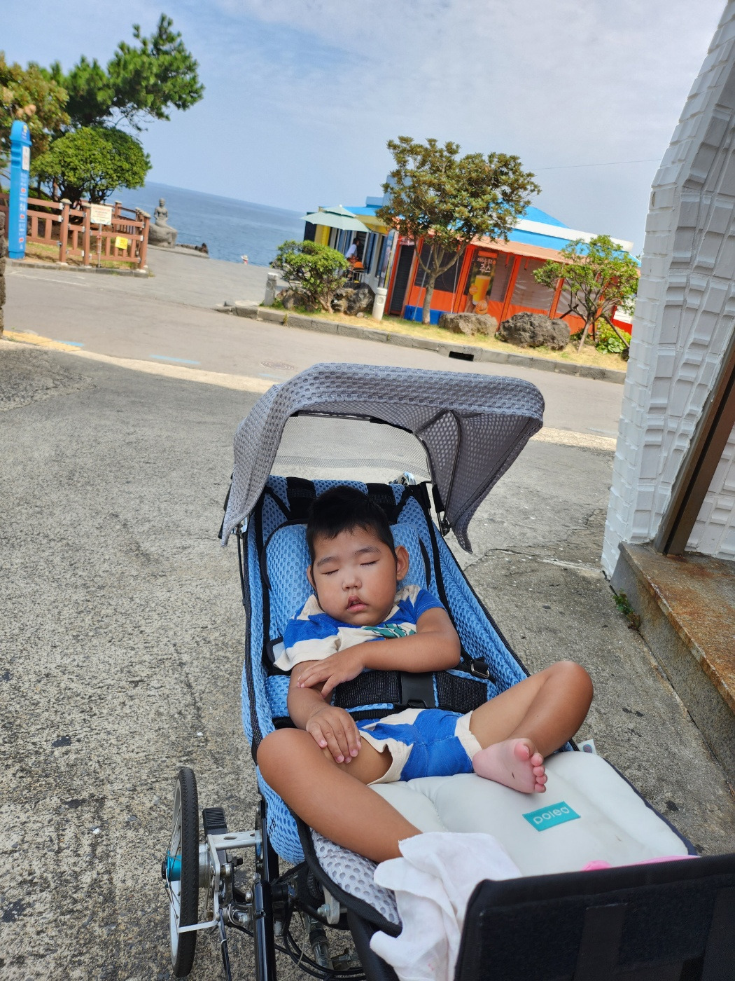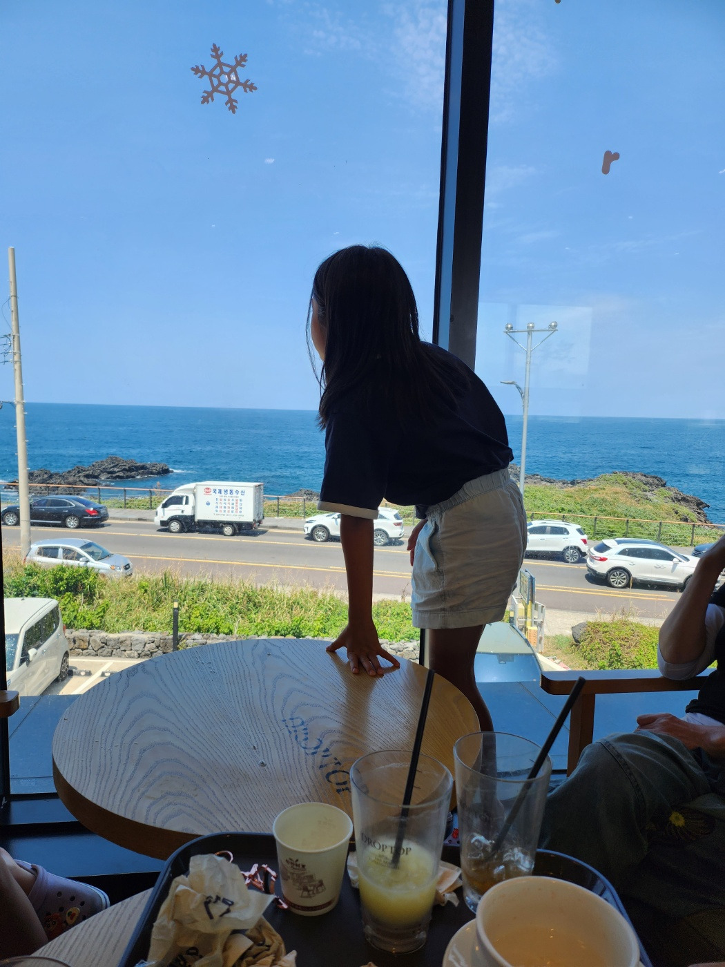 용두암, 자주 들어보긴 했지만 여행 일정으로는 생각하지 못하고 있던 찰나, 가족과 함께 하는 일정 덕분에 가게 되었다. 아무래도 제주공항과 제주항 사이에 있다 보니 도착하자마자 찾아가는 관광지로 유명한 듯 보였다. 오늘도 무더운 날씨 속에서 해변도로를 타고 용두암을 향해 달려갔다. 되도록 해변 가까이에 있는 도로를 통해 가고 싶었지만 막바지에는 큰 도로를 이용할 수밖에 없었고, 운전을 잘하시는 외삼촌 덕분에 길을 헤매는 경험조차 즐거운 시간이었다. 용두암. 말 그대로 용의 머리를 닮은 돌이라 해서 붙여진 이름이다. 용두암뿐만 아니라 주차장 안쪽으로 들어가면 또 다른 코스가 나오는 것 같았는데, 우리 가족은 셋째가 있기 때문에 용두암 앞에서 엄마와 나, 큰 아이들만 용두암이 보이는 곳으로 내려가(유아차에 있던 셋째는 외삼촌이 봐주셨다.) 구경하고, 사진 찍고 다시 계단을 타고 위로 올라갔다. 잠깐 사이에 셋째는 잠이 들었고, 관광 여행 상품을 파는 가게 앞에 큰 그늘이 져 유아차를 잠시 세워두었다. 그 사이, 큰 아이들은 외할머니 찬스로 젤라토를 얻어먹었다. (아마 이 때문에 외할머니를 좋아하는지도.) 잠든 지 얼마 안 된 셋째가 차를 타면 금방 깰 것이 분명하기에 젤라토를 먹는 동안만 잠시 기다렸다가 해변가에 있는 커피숍에 가기로 한 것이다. 우리가 선택한 커피숍은 ‘DROP TOP(제주 제주시 서해안로 540)’ 주차를 하고 들어섰는데, 2층에서 음료를 마실 수 있게 된 커피숍이었다. 셋째 유아차 때문에 엘리베이터가 없는 장소는 엄두를 내지 못했는데, 외삼촌이 있었기에 그럼에도 시도해 볼 만하다는 생각이 들어 꽤 무게가 나가는 유아차를 함께 들고 2층으로 올라갔다. 전면 통유리 창으로 된 2층에서 바라보는 제주 바다는 그야말로 절경 중에 절경이었다. 오전 중이라 사람도 없었던 커피숍. 이모가 오기 전까지 두 눈 가득히 제주 바다를 담아볼 생각이다.