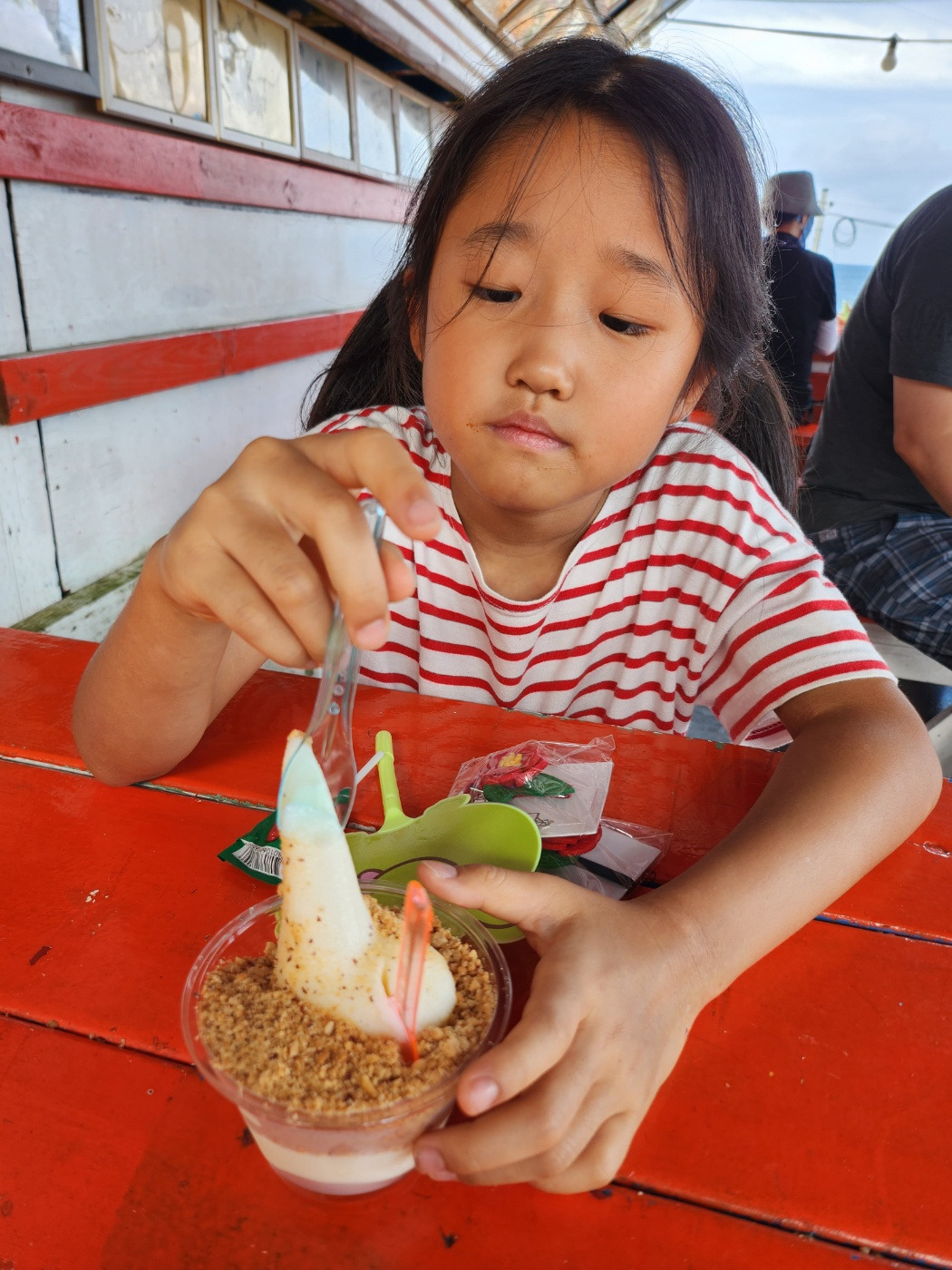 우도에 오면 사람들이 으레 하는 경험들이 있다. 하나는 짜장면 먹기, 또 하나는 땅콩 아이스크림 먹기. 그래서 우리도 늦은 점심으로 짜장면과 탕수육을 먹고, 간식으로 땅콩 아이스크림을 먹기로 했다. 짜장면은 ‘우도 짜장맨(제주 제주시 우도면 우도해안길 1132)’에서 먹었다. 우리와 같은 많은 사람이 점심시간이 훌쩍 지난 늦은 시간임에도 불구하고 짜장면 한 그릇을 먹기 위해 인산인해를 이루었다. 배고플 때 먹어서인지 맛도 그만이었다. 배를 든든히 채우고 우리는 곧바로 땅콩 아이스크림(제주 제주시 우도면 우도해안길 252_우도왕자이야기)을 먹으러 갔다. 아이스크림 배는 또 따로 있으니(?) 거뜬했다. 어른, 아이들 할 것 없이 검멀레 해변을 바라보며 이색적인 맛의 땅콩 아이스크림을 맛보았다. 천막이 드리워진 장소가 따로 마련되어 있어 편안하게 앉아 이야기도 나누며 우도를 보고 느낄 수 있었다. 단 하루, 반나절도 되지 않은 시간이지만 우도에 왔다는 것만으로도 이번 한 달 여행에서 가장 큰 일을 해냈구나 싶었다. 셋째가 아파 중환자실에 입원해 있을 때 만해도 감히 꿈꿀 수 없는 시간이었기에 무사히 퇴원을 하고, 회복해 모두 함께 할 수 있음에 더없이 행복한 시간을 만끽할 수 있었다.