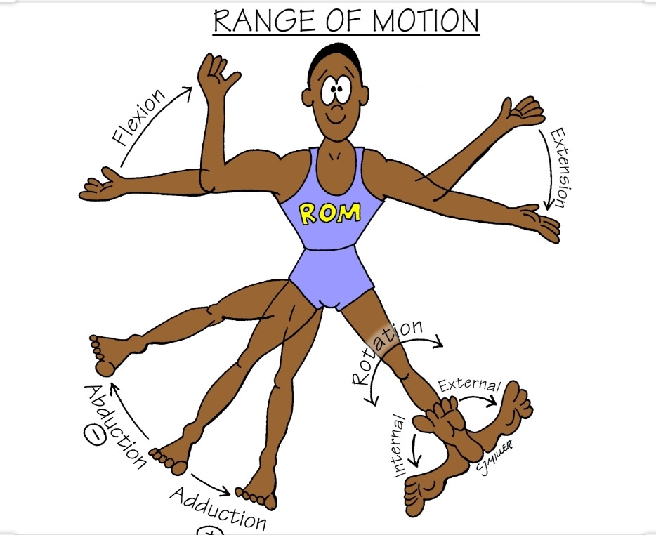 두 번째가 관절 가동범위 운동(Range of motion) ROM 운동이라고도 하며, 관절을 움직이는 범위까지 수동적 또는 능동적으로 운동을 해주어야 한다.
