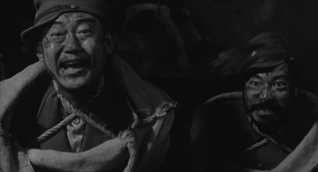반대로 이 영화에선 부감이 등장하지 않는다. 아니 등장은 한다. 첫 쇼트에서 일본군이 아래로 내려가는 장면을 부감으로 잡는다. 하지만 이 쇼트마저 처음부터 부감으로 잡는 것이 아닌 앙각으로 시작해 카메라 시점을 유지하며 자연스럽게 부감으로 이동한다. 반대로 이 영화에선 수많은 앙각 쇼트가 등장한다. 그렇다면 카메라는 왜 부감이 아닌 앙각을 잡는 것인가?