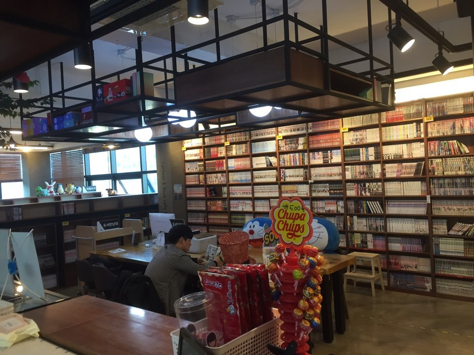 몇 년 전부터 있었던 만화 카페인데, 만화와 음료, 음식까지 같이 즐길 수 있는 곳입니다.