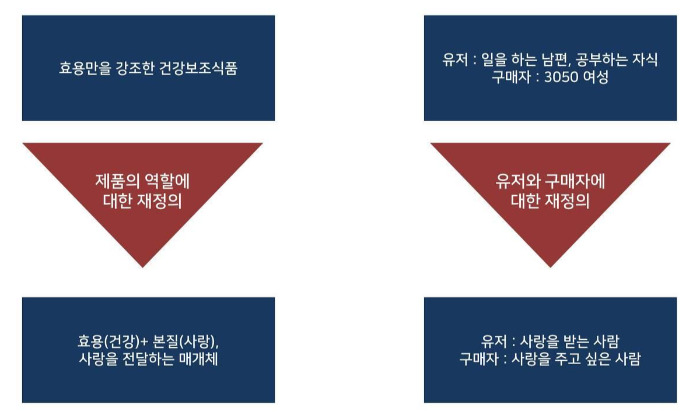 제품/서비스의 유저와 구매자를 명확하게 구분하고 마케팅 프로그램을 진행하는 곳이 바로 정관장입니다. 과거엔 3050 여성을 메인 타겟으로, 남편과 자식을 둔 구매자를 대상으로 마케팅이 진행됐습니다. 현재는 인구통계적 틀에서 벗어나, 사랑을 주고 싶은 사람 - 사랑을 받는 사람으로 나눠 마케팅이 진행되고 있습니다. 제품의 역할, 유저와 구매자에 대한 재정의를 통해 제품의 본질적 가치에 근접하게 됐습니다. 더욱이 보다 넓은 타겟층과 진정성 있는 소통이 가능해졌습니다.