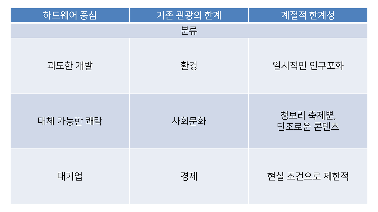 아직 가파도 프로젝트에 대한 분석이 없어, 내 능력선에서 최대한 노력해봤다. 가파도 같은 도서지역의 관광계획은 지금까지 크게 두 가지 방향으로 수립됐는데, 두 방향 모두 많은 문제점을 가지고 있다. 첫째는 골프장-리조트-스키장-대규모 숙박 시설 같은 하드웨어 중심의 개발이다. 이를 위에 제시한 지속 가능한 관광의 개념 관점에서 해석해보자. 먼저 환경적 지속성의 문제다. 이건 자연을 사람이 원하는 대로 재단하는 것이기 때문에 지역 생태계 파괴와 같은 심각한 환경문제를 불러온다. 실제로 가파도에도 리조트가 생길뻔했으나, IMF 이후 공사가 중단되면서 흉물 단지로 전락했다. 설령 완공이 되더라도 문제다. 하드웨어 중심의 개발은 거대 자본이 필연적이다. 따라서 완공이 되더라도 지역민에게 이익이 돌아가는 구조가 아니다. 시설을 짓고 운영하는 대기업에 돌아간다. 게다가 이런 시설은 해당 도서지역만의 특수한 사회문화가 반영되지 않은, 단순히 쾌락 중심 공간이다. 따라서 굳이 가파도가 아니더라도 해당 시설이 있는 다른 곳에서 대체 가능하다. 따라서 이러한 획일적인 경험은 가파도를 방문할 이유가 되지 못했다. 지역 고장만의 고유한 문화가 사라진 공간에 관광객은 굳이 오지 않는다.