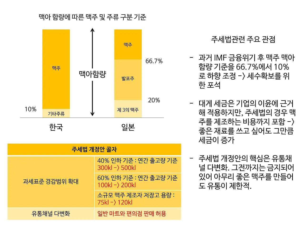 그러나 개정안의 의도와 정책을 면밀히 살펴볼 때, 이번 개정안은 나쁘지 않다. 2가지로 풀이할 수 있는데, 하나는 인하 기준을 완화해 세금에 대한 부담을 줄여주는 것이다. 이는 중소기업의 시장 진입 돕기 위한 정책으로 풀이된다. 다른 하나는 유통채널 다변화다. 지금까지 아무리 좋은 맥주를 만들더라도, 유통채널이 제한적이었다. 애초에 중소기업이 자생할 수 있는 경영조건이 아니었다. 이번 개정안은 일정 수준의 세수혜택과 자생이 가능한 경영 환경 조성으로 중소기업의 시장 진입을 돕도록 기획됐다. 애당초 편의점이나 마트에서 중소기업 맥주를 눈 씻고 찾아볼 수 없었다. 즉, 애초에 시장에 수제 맥주 및 중소기업이 존재하지 않았다. 따라서 이번 개정안을 중소기업의 성장을 저해한다고 오로지 부정적인 시선으로 바라보는 것은 옳지 않다. 단계적인 접근일 뿐 이번 개정안으로 중소기업이 시장에 진입할 수 있도록 활로를 놔주고, 다음 개정안에선 성장을 위해 숨통을 트여주는 정책이 나올 것으로 예상된다.
