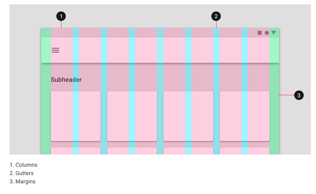 Columns은 스크린에서 콘텐츠가 포함되는 영역을 말합니다. 칼럼은 여러 스크린 사이즈에 유연하게 반응하기 위해 보통 고정 값보다는 퍼센트로 정의될 때가 더 많습니다. column의 개수는 여러 스크린 사이즈의 breakpoint에 따라 결정됩니다. 예를 들면 모바일에서는 4 columns grid를 사용하고 태블릿에서는 8 columns grid를 사용한다 라고 정의를 내릴 수 있는 거죠.